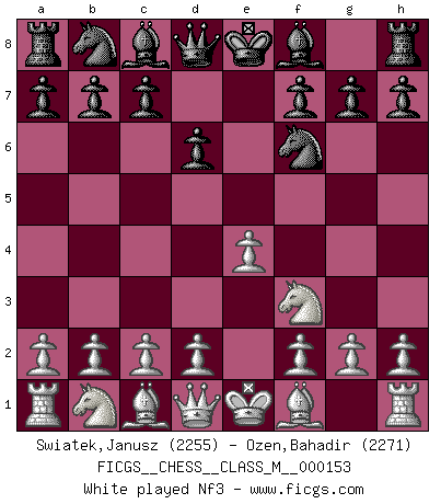 Last move : 1/2-1/2 2025 July 1 19:53:57 [Event "FICGS__CHESS__CLASS_M__000153"] [Site "FICGS"] [Date "2025.04.27"] [Round "1"] [White "Swiatek,Janusz"] [Black "Ozen,Bahadir"] [Result "1/2-1/2"] [WhiteElo "2255"] [BlackElo "2271"] 1.e4 e5 2.Nf3 Nf6 3.Nxe5 d6 4.Nf3 Nxe4 5.d4 d5 6.Bd3 Bd6 7.O-O O-O 8.c4 c6 9.Re1 Bf5 10.Qb3 Qd7 11.Nc3 Nxc3 12.Bxf5 Qxf5 13.bxc3 b6 14.cxd5 cxd5 15.Ba3 Bxa3 16.Qxa3 Nc6 17.h4 Rad8 18.Re3 Na5 19.Re7 Nc6 20.Re3 Na5 1/2-1/2 Follow this game move after move (download)It was clear to me that the vulnerable point of the American Grandmaster (Bobby Fischer) was in double-edged, hanging, irrational positions, where he often failed to find a win even in a won position. (Efim Geller) Wenn du auf das Glück wartest, wird das Leben ziemlich langweilig. (Mikhail Nekhemyevich Tal) El Peón aislado arroja penumbra sobre todo el tablero. (Aaron Nimzovich) Demandez au pauvre Cg1 ce qu'il en pense. Eduard Gufeld à propos de la variante Saemisch de l'Est-Indienne. Chess is everything: art, science and sport. (Anatoly Karpov)