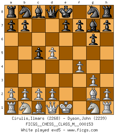 Last move : 1-0 2025 August 7 13:59:25 [Event "FICGS__CHESS__CLASS_M__000153"] [Site "FICGS"] [Date "2025.04.27"] [Round "1"] [White "Cirulis,Ilmars"] [Black "Dyson,John"] [Result "1-0"] [WhiteElo "2268"] [BlackElo "2239"] 1.e4 c5 2.g3 g6 3.Bg2 Bg7 4.f4 d5 5.exd5 Nh6 6.Nc3 O-O 7.Nf3 e6 8.dxe6 Bxe6 9.O-O Nc6 10.d3 c4 11.Kh1 1-0 This chess game has been lost on time (started : 2025.04.27 0:2:52) Follow this game move after move (download)It is not enough to be a good player... you must also play well. (Siegbert Tarrasch) Ich kenne keine einzige Person, die behaupten würde, Garri Kasparow sei ein guter Mensch (Nigel Short) Prefiero perder una partida realmente buena, que ganar una mala. (David Levy) Dans le domaine de la peinture, de la gravure et de la sculpture, dès la première décennie de notre siècle, les artistes abandonnent la représentation de la partie d'échecs pour se concentrer sur les pièces, sur les échiquiers et sur toutes les variations auxquelles les unes et les autres peuvent donner lieu. On passe en quelque sorte d'un thème social à un thème musical (au sens de la musica médiévale, c'est-à-dire d'une notion qui inclue le rythme, l'harmonie, la construction et la déconstruction, etc.). Graphiquement et picturalement, l'échiquier apparaît comme une structure ouverte, dynamique, d'une richesse infinie, autorisant toutes les combinatoires et débouchant sur des mouvements et des rythmes de nature exponentielle. (Michel Pastoureau) If I had no sense of humor, I would long ago have committed suicide. (Mahatma Gandhi)
