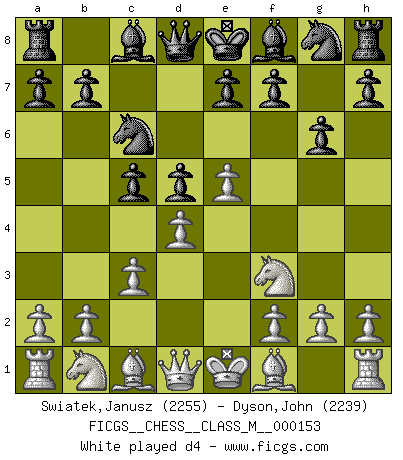 Last move : 1-0 2025 August 4 5:7:38 [Event "FICGS__CHESS__CLASS_M__000153"] [Site "FICGS"] [Date "2025.04.27"] [Round "1"] [White "Swiatek,Janusz"] [Black "Dyson,John"] [Result "1-0"] [WhiteElo "2255"] [BlackElo "2239"] 1.e4 c5 2.Nf3 g6 3.c3 d5 4.e5 Nc6 5.d4 cxd4 6.cxd4 Bg4 7.Bb5 Qb6 8.Bxc6+ bxc6 9.Nbd2 Qb5 10.Nb3 e6 11.Bd2 1-0 This chess game has been lost on time (started : 2025.04.27 0:2:52) Follow this game move after move (download)Examine moves that smite! A good eye for smites is far more important than a knowledge of strategical principles. (Purdy) Schach ist ein Teil der Kultur, und wenn es mit der Kultur abwärts geht, geht es auch mit dem Schach abwärts. (Mikhail Moiseyevich Botvinik) El Ajedrez moderno está demasiado preocupado con cosas como la estructura de Peones. Olvidenlo, el Jaque Mate termina la partida. (Nigel Short) On entre au jeu d'Echecs comme on entre en Religion. Pour le joueur d'Echecs, la partie d'Echecs c'est l'office, la messe, le défilé du 1er Mai, le dépôt de gerbe au Monument aux Morts. C'est un drame sacré. (Michel Roos) Memory is a complicated thing, a relative to truth, but not its twin. (Barbara Kingsolver, Animal Dreams)
