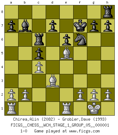 Last move : 1-0 2006 October 10 23:55:14 [Event "FICGS__CHESS__WCH_STAGE_1_GROUP_05__000001"] [Site "FICGS"] [Date "2006.07.01"] [Round "1"] [White "Chirea,Alin"] [Black "Grobler,Dave"] [Result "1-0"] [WhiteElo "2082"] [BlackElo "1993"] 1.e4 c5 2.Nf3 Nc6 3.d4 cxd4 4.Nxd4 Nf6 5.Nc3 e6 6.Nxc6 bxc6 7.e5 Nd5 8.Ne4 f5 9.exf6 Nxf6 10.Nd6+ Bxd6 11.Qxd6 Qb6 12.Bd3 c5 13.Bf4 Bb7 14.O-O Rc8 15.c4 Qxd6 16.Bxd6 Rc6 17.Be5 Kf7 18.Rfe1 1-0 This chess game has been lost on time (started : 2006.07.01 16:5:54) Sicilian defense Kingside Castling by player White (move 14) Player White won this chess game. Follow this game move after move (download)The isolated Pawn casts gloom over the entire chessboard. (Aaron Nimzovich) Du kannst im Schach nur gut werden, wenn du das Spiel liebst. (Robert James Fischer) Hasta este punto, las blancas han seguido un análisis bien conocido. Pero ahora el hace un error fatal: empieza a usar su propia cabeza. (Siegbert Tarrasch) Il n'y a pas eu de défaite parce que je ne crois pas que cet ordinateur ait jamais existé. IBM a triché en refusant d'imprimer les modes de recherche de la machine. C'est évident, pendant le match, des coups décisifs ont été joués par des êtres humains. Aujourd'hui, les meilleurs spécialistes en informatique ne peuvent toujours pas expliquer comment Deep-Blue a pu jouer contre la logique des ordinateurs. IBM a gagné une guerre de communication, mais ils sont incapables de prouver que l'ordinateur a gagné tout seul. (Garry Kasparov) It is the aim of the modern school, not to treat every position according to one general law, but according to the principle inherent in the position. (Richard Reti)