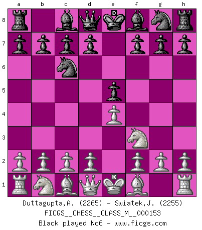 Last move : 1/2-1/2 2025 September 4 15:17:14 [Event "FICGS__CHESS__CLASS_M__000153"] [Site "FICGS"] [Date "2025.04.27"] [Round "1"] [White "Duttagupta,Aniruddha"] [Black "Swiatek,Janusz"] [Result "1/2-1/2"] [WhiteElo "2265"] [BlackElo "2255"] 1.e4 e5 2.Nf3 Nc6 3.Nc3 Nf6 4.g3 Bc5 5.Bg2 d6 6.d3 a5 7.O-O h6 8.h3 a4 9.Bd2 Bd7 10.Kh2 O-O 11.a3 Bb6 12.Ng1 Nd4 13.Nge2 Re8 14.Nxd4 Bxd4 15.f4 Ra6 16.Qf3 Rc6 17.Rae1 exf4 18.gxf4 Rc5 19.Be3 Bxc3 20.bxc3 Rxc3 21.Qf2 Rxa3 22.e5 Nh7 23.Bxb7 Bf5 24.Bc6 Re6 25.Bd5 Nf8 26.Bd2 c5 27.Rb1 dxe5 1/2-1/2 Follow this game move after move (download)I have added these principles to the law: get the Knights into action before both Bishops are developed. (Emanuel Lasker) Man braucht nicht immer den besten Zug zu spielen: Ein Zug muß aktiv, unternehmungslustig, korrekt und schön sein. (David Bronstein) En manos de Fischer's, una diminuta ventaja teórica es tan buena como tener una Reina de ventaja. (Isaac Kashdan) Votre prénom est 'Tactique', votre deuxième prénom est 'Tactique' et votre nom est 'Tactique'. (Ken Smith) I find your interest interesting. (Gregory House, House M.D.)