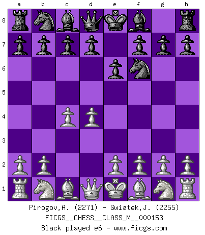 Last move : 1/2-1/2 2025 September 1 21:25:10 [Event "FICGS__CHESS__CLASS_M__000153"] [Site "FICGS"] [Date "2025.04.27"] [Round "1"] [White "Pirogov,Andrey Mikhaylovich"] [Black "Swiatek,Janusz"] [Result "1/2-1/2"] [WhiteElo "2271"] [BlackElo "2255"] 1.d4 Nf6 2.c4 e6 3.Nc3 Bb4 4.e3 O-O 5.Nge2 d5 6.a3 Bd6 7.c5 Be7 8.b4 c6 9.Ng3 b6 10.Be2 a5 11.Bd2 Ba6 12.O-O Nbd7 13.Qc2 Bxe2 14.Ngxe2 Qc8 15.Rfb1 Qa6 16.Qd1 bxc5 17.dxc5 e5 18.Na4 axb4 19.axb4 Qb7 20.Nc1 Rfb8 21.Be1 Bd8 22.Nd3 h5 23.h3 h4 24.Rc1 Bc7 25.Bc3 1/2-1/2 Follow this game move after move (download)A bad day of Chess is better than any good day at work. (Anonymous) Unter Putin wird alles Geld aus Russland wie von einem Staubsauger nach Moskau umgeleitet, das ist wie ein schwarzes Loch. (Garry Kasparov) De eso se trata el Ajedrez. Un día le das una lección a tu oponente y al día siguiente el te da una a tí. (Bobby Fischer) La vie est comme un jeu d'échecs : nous esquissons un plan, mais celui-ci est tributaire de ce que daignent faire l'adversaire aux échecs et le destin dans la vie. (Arthur Schopenhauer) First of all, we have to go back to the classical time control. (Anatoly Karpov)