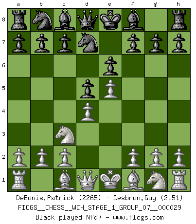 Last move : 1/2-1/2 2025 June 30 1:55:14 [Event "FICGS__CHESS__WCH_STAGE_1_GROUP_07__000029"] [Site "FICGS"] [Date "2025.04.29"] [Round "1"] [White "DeBonis,Patrick"] [Black "Cesbron,Guy"] [Result "1/2-1/2"] [WhiteElo "2265"] [BlackElo "2151"] 1.e4 e6 2.d4 d5 3.Nc3 Nf6 4.e5 Nfd7 5.f4 c5 6.Nf3 Nc6 7.Be3 Be7 8.Qd2 O-O 9.dxc5 Nxc5 10.O-O-O a6 11.Bxc5 Bxc5 12.Kb1 b5 13.Bd3 Ra7 14.g4 f6 15.exf6 gxf6 16.g5 f5 17.Ne2 Qb6 18.Ng3 Be3 19.Qg2 Ne7 20.Nh5 Ng6 21.Qg3 Bf2 22.Qh3 Be3 23.Qg3 1/2-1/2 Follow this game move after move (download)The Pawns are the soul of the game. (Francois Andre Danican Philidor) Ich möchte Schüler heranbilden, die das Vermögen haben, selbst zu denken und Kritik zu üben. (Emanuel Lasker) Repentinamente, me resultaba obvio en mi analisis que yo había pasado por alto lo que Fischer había visto en el tablero con la mas grande facilidad. (Mikhail Botvinnik) Un footballeur joue avec ses pieds, parfois avec sa tête. Un joueur d'échecs ne joue qu'avec sa tête. Et quand il ne joue plus, il meurt. (Jacob Murray) You have to believe in yourself. (Sun Tzu)