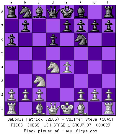 Last move : 1-0 2025 July 20 11:55:39 [Event "FICGS__CHESS__WCH_STAGE_1_GROUP_07__000029"] [Site "FICGS"] [Date "2025.04.29"] [Round "1"] [White "DeBonis,Patrick"] [Black "Vollmer,Steve"] [Result "1-0"] [WhiteElo "2265"] [BlackElo "1843"] 1.e4 c5 2.Nf3 d6 3.d4 cxd4 4.Nxd4 Nf6 5.Nc3 a6 6.Be3 Nc6 7.f3 e5 8.Nb3 Be7 9.Qd2 Be6 10.Nd5 Nd7 11.O-O-O Bxd5 12.exd5 Ncb8 13.g4 b6 14.f4 f6 15.Bd3 Nc5 16.Nxc5 bxc5 17.fxe5 fxe5 18.Rhf1 Nd7 19.g5 g6 20.h4 c4 21.Bxc4 Qc7 22.Qd3 Nc5 23.Bxc5 Qxc5 24.Bxa6 Rb8 25.a4 Bd8 26.Bb5+ Ke7 27.Qf3 Ba5 28.Qf6+ 1-0 Follow this game move after move (download)There are two types of sacrifices: correct ones and mine. (Mikhail Tal) Wie bekannt hörte Morphy 1859 auf, Schach zu spielen. Seine Enttäuschung galt nicht so sehr dem Schach, wie den Schachspielern. (Robert James Fischer) El Ajedrez no es como la vida... ¡tiene reglas!. (Mark Pasternak) Vouloir jouer aux échecs contre soi-même est aussi paradoxal que vouloir marcher sur son ombre. (Stefan Zweig) The meaning of life is that it is to be lived, and it is not to be traded and conceptualized and squeezed into a pattern of systems. (Bruce Lee)