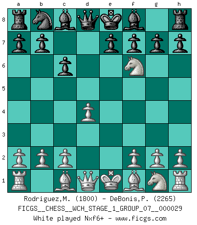 Last move : 1/2-1/2 2025 August 18 1:12:58 [Event "FICGS__CHESS__WCH_STAGE_1_GROUP_07__000029"] [Site "FICGS"] [Date "2025.04.29"] [Round "1"] [White "Rodriguez,Mariano"] [Black "DeBonis,Patrick"] [Result "1/2-1/2"] [WhiteElo "1800"] [BlackElo "2265"] 1.e4 c6 2.Nc3 d5 3.d4 dxe4 4.Nxe4 Nf6 5.Nxf6+ exf6 6.Nf3 Bd6 7.Bd3 O-O 8.O-O Bg4 9.h3 Bh5 10.Re1 Nd7 11.g4 Bg6 12.Nh4 c5 13.Nxg6 hxg6 14.c3 Qb6 15.Qb3 cxd4 16.Qxb6 Nxb6 17.cxd4 Rad8 18.Kg2 g5 19.Bc2 Nd5 20.Kf3 g6 21.Bb3 Bb4 22.Re2 Kg7 23.Rc2 Rh8 24.Kg2 Rhe8 25.a3 Bf8 26.Bxd5 Rxd5 27.Be3 Red8 28.Rac1 Rb5 29.b4 a5 30.bxa5 Bxa3 31.Ra1 Rxa5 32.Rca2 Rda8 33.Bd2 R5a6 34.Rb1 R8a7 35.Rc2 Re6 36.Be3 Re7 37.d5 Ra6 38.Ra2 Re5 39.Rd2 Re8 40.Rd3 Rb8 41.Rdb3 Bd6 42.Rxb7 1/2-1/2 Follow this game move after move (download)I have never in my life played the French Defence, which is the dullest of all openings. (Wilhelm Steinitz) Jeder leidlich begabte Spieler, er braucht keineswegs hervorragend veranlagt zu sein, kann es zum Meister bringen. Aber das ist ja auch gar nicht nötig! Der richtige Standpunkt ist es, zu seinem Vergnügen zu spielen, und man glaube ja nicht, dass der Genuss proportional dem Können sei. (Siegbert Tarrasch) ¿Que sería del Ajedrez sin errores graciosos?. (Kurt Richter) On entre au jeu d'Echecs comme on entre en Religion. Pour le joueur d'Echecs, la partie d'Echecs c'est l'office, la messe, le défilé du 1er Mai, le dépôt de gerbe au Monument aux Morts. C'est un drame sacré. (Michel Roos) When you don't know what to do, walk fast and look worried. (Anonymous)