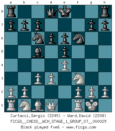 Last move : 0-1 2025 June 15 8:1:29 [Event "FICGS__CHESS__WCH_STAGE_1_GROUP_07__000029"] [Site "FICGS"] [Date "2025.04.29"] [Round "1"] [White "Curtacci,Sergio"] [Black "Ward,David"] [Result "0-1"] [WhiteElo "2245"] [BlackElo "2208"] 1.e4 e5 2.Nf3 Nc6 3.Bc4 Bc5 4.c3 Nf6 5.d3 d6 6.O-O Be6 7.Bxe6 fxe6 8.b4 Bb6 9.Qb3 Qd7 10.a4 a6 11.Ba3 O-O 0-1 This chess game has been lost on time (started : 2025.04.29 16:20:28) Follow this game move after move (download)Of all my Russian books, the defense contains and diffuses the greatest 'warmth' which may seem odd seeing how supremely abstract Chess is supposed to be. (Vladimir Nabokov) Schach sollte überall auf der Welt Schulfach werden. Es fördert die geistige Auseinandersetzung. Es lehrt die Demut in der Niederlage. (Garry Kasparov) La vida es como un juego de Ajedrez, cambiando con cada movimiento. (Proverbio Chino) Les Echecs ne sont pas pour les âmes timides. Ils requièrent un homme entier, qui ne s'arrête pas aveuglément à ce qui a été déjà établi, mais qui tente individuellement de sonder les profondeurs du jeu. (W. Steinitz) Your best chance to get a Royal Flush in a casino is in the bathroom. (Anonymous)