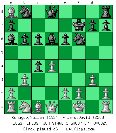 Last move : 0-1 2025 October 2 3:22:50 [Event "FICGS__CHESS__WCH_STAGE_1_GROUP_07__000029"] [Site "FICGS"] [Date "2025.04.29"] [Round "1"] [White "Kehayov,Yulian"] [Black "Ward,David"] [Result "0-1"] [WhiteElo "1954"] [BlackElo "2208"] 1.d4 Nf6 2.c4 e6 3.Nf3 b6 4.g3 Ba6 5.b3 d5 6.Bg2 dxc4 7.Ne5 Bb4+ 8.Kf1 Bd6 9.Nxf7 Kxf7 10.Bxa8 c6 11.bxc4 Bc5 12.Bb2 e5 13.Nd2 Bxd4 14.Bxd4 Qxd4 15.Nf3 Qxd1+ 16.Rxd1 Ke6 17.Ng5+ Ke7 18.Nf3 Ke6 19.Kg2 Rc8 20.Rd3 Bxc4 21.Re3 Kd6 22.Nxe5 Bxa2 23.f3 a5 24.Rd1+ Nd5 25.Kf2 a4 26.Nf7+ Kc7 27.Re6 b5 28.Nd6 Bb3 29.Rd2 Kd7 30.Nxc8 Kxe6 31.Na7 b4 32.Bxc6 a3 33.Bxd5+ Bxd5 34.Nb5 Bc4 35.Nd4+ Kd6 36.Nb3 Ke7 37.Na5 Be6 38.Rd1 b3 39.Nxb3 Bxb3 40.Ra1 a2 41.Ke3 Kd6 42.Kd4 Nc6+ 43.Kc3 Bd5 44.e4 Bg8 45.f4 Kc5 46.Rc1 Bc4 47.Rd1 Nd4 48.Ra1 Bb3 49.e5 Nc2 50.Kxb3 Nxa1+ 51.Kxa2 Nc2 52.Kb2 Ne3 53.Kc3 Nf1 54.Kd3 Kd5 55.Ke2 Nxh2 56.Kf2 Ng4+ 57.Kf3 h5 58.Kg2 g6 59.Kh3 Nxe5 60.fxe5 g5 61.e6 Kxe6 62.Kg2 Ke5 63.Kf3 Kd4 64.Ke2 Ke4 65.Kf2 Kd3 66.Kf3 g4+ 67.Kf2 Kd2 68.Kf1 Ke3 69.Kg2 Ke2 70.Kg1 Kf3 71.Kh2 Kf2 72.Kh1 Kxg3 73.Kg1 Kh3 74.Kh1 g3 75.Kg1 g2 76.Kf2 Kh2 77.Ke1 g1Q+ 78.Ke2 Qd4 79.Kf1 Kg3 80.Ke1 Kf3 81.Kf1 Qf2+ 0-1 Follow this game move after move (download)After a bad opening, there is hope for the middle game. After a bad middle game, there is hope for the endgame. But once you are in the endgame, the moment of truth has arrived. (Edmar Mednis) Gewinnen beim Schach fördert das Selbstvertrauen. Beim Sex spüre ich sowas nicht... (Garry Kasparov) Muchos se han convertido en Maestros de Ajedrez, nadie se ha convertido en el Maestro del Ajedrez. (Siegbert Tarrasch) On peut tirer plus d'utilité d'une partie perdue que de 100 parties gagnées. (Capablanca) Don't anthropomorphize computers - they hate it. (Anonymous)