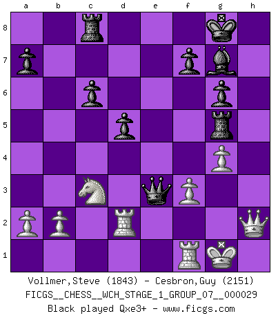 Last move : 0-1 2025 August 15 0:43:13 [Event "FICGS__CHESS__WCH_STAGE_1_GROUP_07__000029"] [Site "FICGS"] [Date "2025.04.29"] [Round "1"] [White "Vollmer,Steve"] [Black "Cesbron,Guy"] [Result "0-1"] [WhiteElo "1843"] [BlackElo "2151"] 1.d4 Nf6 2.c4 c6 3.Nf3 d5 4.cxd5 cxd5 5.e3 g6 6.Nc3 Bg7 7.Bd3 O-O 8.O-O Nc6 9.Qe2 Bg4 10.h3 Bxf3 11.Qxf3 Re8 12.Bb5 Rc8 13.g4 e5 14.Bxc6 bxc6 15.dxe5 Rxe5 16.Bd2 h5 17.Qf4 Ne4 18.Rad1 Qe7 19.Qh2 Nxd2 20.Rxd2 hxg4 21.hxg4 Rg5 22.f3 Qxe3+ 23.Qf2 Qf4 24.Kg2 f5 25.Qe2 fxg4 26.Qe6+ Kh7 27.Rh1+ Rh5 28.Rxh5+ gxh5 29.Rf2 Rf8 30.Qe2 Be5 0-1 Follow this game move after move (download)A good player is always lucky. (Jose Raul Capablanca) Deine Wertungszahl - vorausgesetzt einige Jahre schachliche Anstrengung - entspricht etwa dem zehnfachen Deines IQ plus 1000. (Jonathan Levitt) La pasion por jugar al Ajedrez es una de las mas inexplicables en el mundo. (H.G. Wells) La vie et les Echecs sont tous les deux une lutte constante. (Lasker) When I took office, only high energy physicists had ever heard of what is called the World Wide Web... Now even my cat has its own page. (Bill Clinton, 1996)