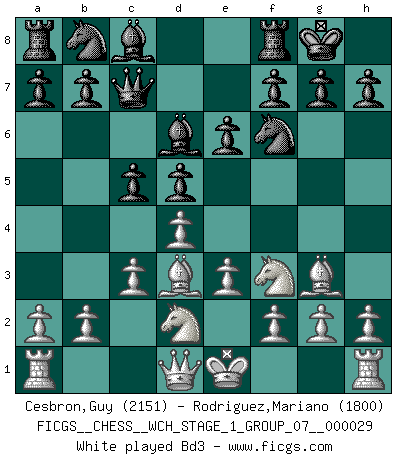 Last move : 1/2-1/2 2025 July 12 2:14:35 [Event "FICGS__CHESS__WCH_STAGE_1_GROUP_07__000029"] [Site "FICGS"] [Date "2025.04.29"] [Round "1"] [White "Cesbron,Guy"] [Black "Rodriguez,Mariano"] [Result "1/2-1/2"] [WhiteElo "2151"] [BlackElo "1800"] 1.d4 Nf6 2.Nf3 d5 3.Bf4 e6 4.e3 c5 5.c3 Bd6 6.Bg3 Qc7 7.Nbd2 O-O 8.Bd3 Nbd7 9.Bxd6 Qxd6 10.O-O e5 11.e4 exd4 12.cxd4 dxe4 13.Nxe4 Nxe4 14.Bxe4 Nf6 15.Re1 h6 16.dxc5 Qxc5 17.h3 Be6 18.Qd4 Nxe4 19.Qxe4 Rfd8 20.Rad1 Rxd1 21.Rxd1 Qc7 22.a3 a6 23.Nd4 Rd8 24.Re1 Bd7 25.Nf5 Re8 26.Ne7+ Kh8 27.Qd4 Bc6 28.Qc5 Qf4 29.Re3 Rd8 30.Qc2 Bb5 31.b3 Qd6 32.Qf5 Qd1+ 33.Kh2 Qd6+ 34.Kg1 Be8 35.b4 Qd1+ 36.Kh2 Qd6+ 37.Kg1 Qc7 38.g3 Qd6 39.Kh2 g6 40.Qf3 Kg7 41.Qxb7 Bb5 42.Qe4 Rd7 1/2-1/2 Follow this game move after move (download)In Chess, at least, the brave inherit the earth. (Edmar Mednis) Ein Kibitz ist einer, der deinem Gegner gute Ratschläge gibt. (Andrew Soltis) Los Peones son nacidos libres, y aún así, se encuentran encadenados por todos lados. (Rick Kennedy) Les Echecs représentent une sphère d'idées créatrices basée sur la volonté des deux protagonistes. (Smyslov) It is not true that people stop pursuing dreams because they grow old, they grow old because they stop pursuing dreams. (Gabriel Garcia Marquez)