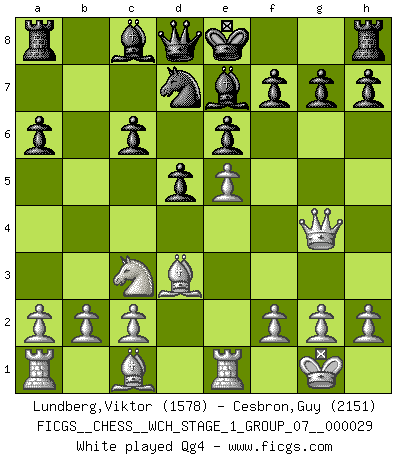 Last move : 0-1 2025 July 11 9:5:16 [Event "FICGS__CHESS__WCH_STAGE_1_GROUP_07__000029"] [Site "FICGS"] [Date "2025.04.29"] [Round "1"] [White "Lundberg,Viktor"] [Black "Cesbron,Guy"] [Result "0-1"] [WhiteElo "1578"] [BlackElo "2151"] 1.e4 c5 2.Nf3 a6 3.Nc3 e6 4.d4 cxd4 5.Nxd4 Nc6 6.Nxc6 bxc6 7.Bd3 d5 8.O-O Nf6 9.Re1 Be7 10.e5 Nd7 11.Qg4 Kf8 12.Qf3 Kg8 13.b3 Bb7 14.Na4 Qc7 15.c4 d4 16.h4 c5 17.Be4 Bxe4 0-1 This chess game has been lost on time (started : 2025.04.29 16:20:28) Follow this game move after move (download)The boy (then a 12 year old boy named Anatoly Karpov) doesn't have a clue about Chess, and there's no future at all for him in this profession. (Mikhail Botvinnik) Jeder Fehler erscheint unglaublich dumm, wenn andre ihn begehen. (Georg Christoph Lichtenberg) ¿Quién es tu oponente esta tarde? Esta tarde mi oponente son las piezas negras. (Akiba Rubinstein) Même un GMI sait rarement calculer sur plus de cinq coups une attaque à sacrifices. (Rudolf Spielmann) Luck never made a man wise. (Seneca, Letters to Lucilius)