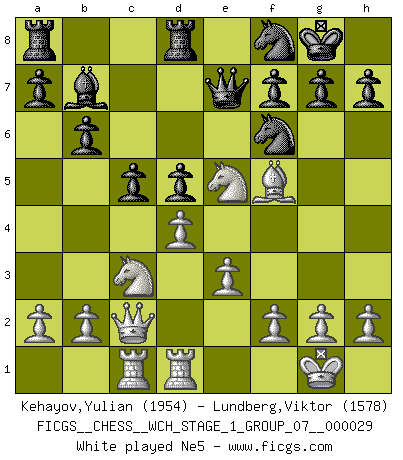 Last move : 1-0 2025 June 28 3:52:42 [Event "FICGS__CHESS__WCH_STAGE_1_GROUP_07__000029"] [Site "FICGS"] [Date "2025.04.29"] [Round "1"] [White "Kehayov,Yulian"] [Black "Lundberg,Viktor"] [Result "1-0"] [WhiteElo "1954"] [BlackElo "1578"] 1.d4 Nf6 2.Nf3 e6 3.c4 Bb4+ 4.Bd2 Bxd2+ 5.Qxd2 d5 6.e3 O-O 7.Nc3 Qe7 8.Rc1 Rd8 9.cxd5 exd5 10.Bd3 Nbd7 11.O-O b6 12.Qc2 Bb7 13.Rfd1 c5 14.Bf5 Nf8 15.Ne5 Ne4 16.h3 1-0 This chess game has been lost on time (started : 2025.04.29 16:20:28) Follow this game move after move (download)No Chess Grandmaster is normal; they only differ in the extent of their madness. (Viktor Korchnoi) Mein erstes Ziel war nicht, die Partie zu gewinnen, sondern eine Figur zu opfern. -- der junge (Wilhelm Steinitz) El Ajedrez es el gimnasio de la mente. (Blaise Pascal) La vérité est comme le meilleur coup aux échecs : elle existe, mais il faut la chercher. (Arturo Perez-Reverte) Plans are ideas that never come to fruition. (Daniel Parmet)