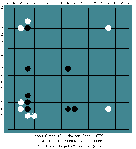 Last move : 0-1 2007 October 3 16:39:29 [Event "FICGS__GO__TOURNAMENT_KYU__000045"] [Site "FICGS"] [Date "2007.09.30"] [Round "1"] [Black "Lemay,Simon"] [White "Madsen,John"] [Result "0-1"] [Rating 2 "0799"] 1.k10 q4 2.k4 d3 3.d4 c4 4.d10 c16 5.d16 d17 6.l4 q16 7.d5 c5 8.d6 e3 0-1 Here are the names of the openings (joseki) played in the four corners : Corner d4 : d3 d4 Komoku (Somok, Xiao~mu`) 3-4 Point. The komoku (3-4) point is the traditional corner enclosure move.. Corner d16 : c16 d16 Komoku (Somok, Xiao~mu`) 3-4 Point. The komoku (3-4) point is the traditional corner enclosure move.. Corner q4 : q4 l4 Hoshi (Hwajeom, Seongjeom, Xingwei`) 4-4 Point. The star or hoshi (4-4) point, emphasizing influence at the potential expense of territory. Player White won this Go (weiqi, baduk) game. Follow this game move after move (download)If you have lost four corners, resign. (Anonymous) Shallow men believe in luck. Strong men belive in cause and effect. (Ralph Waldo Emerson)
