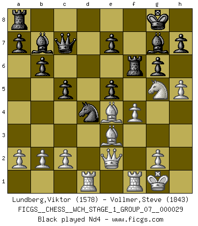 Last move : 0-1 2025 July 6 3:12:45 [Event "FICGS__CHESS__WCH_STAGE_1_GROUP_07__000029"] [Site "FICGS"] [Date "2025.04.29"] [Round "1"] [White "Lundberg,Viktor"] [Black "Vollmer,Steve"] [Result "0-1"] [WhiteElo "1578"] [BlackElo "1843"] 1.e4 Nf6 2.Nc3 d6 3.d4 g6 4.f4 Bg7 5.Nf3 O-O 6.Bd3 c5 7.dxc5 dxc5 8.e5 Nd5 9.Nxd5 Qxd5 10.Qe2 Nc6 11.Be4 Qd8 12.Be3 Qc7 13.O-O b6 14.Rad1 Bb7 15.e6 fxe6 16.Ng5 Rf6 17.h4 e5 18.h5 Nd4 19.Qc4+ Kh8 0-1 This chess game has been lost on time (started : 2025.04.29 16:20:28) Follow this game move after move (download)Chess is as much a mystery as women. (Purdy) Modernes Schach erfordert enorme Anspannung. Es ist für einen normalen Menschen unmöglich das auszuhalten. (Viktor Kortschnoi) El juego de Damas es para vagabundos. (Paul Morphy) Je crois qu'il existe des manières très spécifiques de jouer efficacement contre une machine. Evidemment, nous n'avons aucune chance en technique pure, parce que l'ordinateur calcule de manière parfaite. Mais lorsque nous faisons appel à notre cerveau, en utilisant l'intuition et la compréhension, alors nous restons beaucoup plus forts. (Anatoli Karpov) A clear conscience is usually the sign of a bad memory. (Unknown)