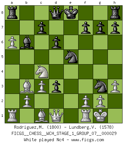 Last move : 1-0 2025 June 27 14:33:36 [Event "FICGS__CHESS__WCH_STAGE_1_GROUP_07__000029"] [Site "FICGS"] [Date "2025.04.29"] [Round "1"] [White "Rodriguez,Mariano"] [Black "Lundberg,Viktor"] [Result "1-0"] [WhiteElo "1800"] [BlackElo "1578"] 1.e4 e5 2.Nf3 Nc6 3.Bb5 a6 4.Ba4 Nf6 5.O-O b5 6.Bb3 Bc5 7.c3 d6 8.d4 Bb6 9.a4 Bg4 10.h3 Bxf3 11.Qxf3 exd4 12.axb5 Ne5 13.Qd1 d3 14.bxa6 Nxe4 15.Nd2 Ng3 16.Nc4 Nxf1 17.Nxb6 1-0 This chess game has been lost on time (started : 2025.04.29 16:20:28) Follow this game move after move (download)Life is a kind of Chess, with struggle, competition, good and ill events. (Benjamin Franklin) Oft bringt ein stiller Zug das Erdbeben. (Richard Reti) Entre mas años cumplo, mas valoro los Peones. (Keres) Soyez une menace à chaque fois que vous vous asseyez pour jouer. (Ken Smith) Life is painting a picture, not doing a sum. (Oliver Wendell Holmes, Jr.)