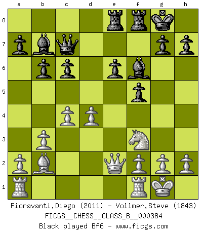 Last move : 0-1 2025 October 5 0:44:35 [Event "FICGS__CHESS__CLASS_B__000384"] [Site "FICGS"] [Date "2025.04.29"] [Round "1"] [White "Fioravanti,Diego"] [Black "Vollmer,Steve"] [Result "0-1"] [WhiteElo "2011"] [BlackElo "1843"] 1.d4 d5 2.Nf3 e6 3.c4 c6 4.e3 Nf6 5.Nc3 Nbd7 6.Qc2 Be7 7.b3 b6 8.Bd3 Bb7 9.Bb2 Rc8 10.e4 dxe4 11.Nxe4 Nxe4 12.Bxe4 Nf6 13.Nd2 Nxe4 14.Qxe4 O-O 15.O-O Qc7 16.Qg4 f5 17.Qe2 Rce8 18.Nf3 Bf6 19.Ne5 Bxe5 20.dxe5 c5 21.Rad1 Rd8 22.f3 h6 23.Rfe1 Rfe8 24.Kf2 Kf7 25.Bc3 a5 0-1 This chess game has been lost on time (started : 2025.04.29 21:49:9) Follow this game move after move (download)Though most people love to look at the games of the great attacking masters, some of the most successful players in history have been the quiet positional players. They slowly grind you down by taking away your space, tying up your pieces, and leaving you with virtually nothing to do ! (Yasser Seirawan) Frage des Reporters: -Worin besteht das Ziel von Gambiteröffnungen? Antwort: -Auf Kosten der Partie einen Ruf als Angriffspieler zu erwerben.- (Siegbert Tarrasch) Un jugador que es sorprendido, esta derrotado a medias. (Proverbio) Comme les marins qui ont mille raisons différentes d'aller en mer, les joueurs d'échecs en ont tout autant avant de s'installer devant une table et jouer... (Vincent Bertignac, philosophe) Tomorrow's what you make of it. (Horatio Caine, C.S.I. Miami)