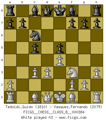 Last move : 0-1 2025 September 3 8:31:59 [Event "FICGS__CHESS__CLASS_B__000384"] [Site "FICGS"] [Date "2025.04.29"] [Round "1"] [White "Tedoldi,Guido"] [Black "Vasquez,Fernando"] [Result "0-1"] [WhiteElo "1810"] [BlackElo "2079"] 1.c4 e5 2.Nc3 Nf6 3.d3 d5 4.cxd5 Nxd5 5.e4 Nxc3 6.bxc3 c5 7.Nf3 Nc6 8.h3 Be7 9.Be2 O-O 10.O-O Be6 11.Be3 b5 12.c4 b4 13.Qc1 a5 14.Nh2 a4 15.f4 exf4 16.Bxf4 Bf6 17.Rb1 b3 18.axb3 a3 19.Qd2 a2 20.Rbc1 a1Q 21.Rxa1 Rxa1 22.Bf3 Be5 23.Rxa1 Qd4+ 0-1 Follow this game move after move (download)Winning isn't everything... but losing is nothing. (Mednis) Besser ein falscher Plan, logisch durchgeführt, als gar kein Plan. (Viktor Kortschnoi) Botvinnik trató de alejar el misterio referente al Ajedrez, siempre relacionandolo a situaciones de la vida diaria. Solía llamar al Ajedrez un problema inexacto típico, similar a aquellos en que la gente tiene siempre que resolver a cada día. (Garry Kasparov) Psychologiquement, tu dois avoir confiance en toi même, mais cette confiance doit être basée sur des faits. (Robert Fischer) Life doesn't imitate art, it imitates bad television. (Woody Allen)
