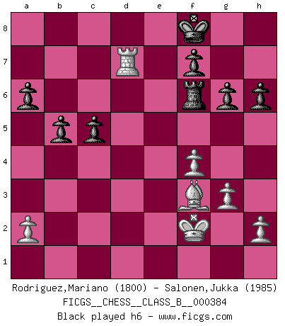 Last move : 1-0 2025 July 2 7:51:56 [Event "FICGS__CHESS__CLASS_B__000384"] [Site "FICGS"] [Date "2025.04.29"] [Round "1"] [White "Rodriguez,Mariano"] [Black "Salonen,Jukka"] [Result "1-0"] [WhiteElo "1800"] [BlackElo "1985"] 1.e4 e5 2.Nf3 Nc6 3.Bb5 a6 4.Ba4 Nf6 5.O-O b5 6.Bb3 Bb7 7.Re1 Bc5 8.c3 O-O 9.d4 Bb6 10.Nbd2 exd4 11.cxd4 Bxd4 12.e5 Ng4 13.Ne4 Bxe5 14.Nxe5 Ngxe5 15.Bg5 Qc8 16.f4 d5 17.Bxd5 Nc4 18.Nc5 Rb8 19.Nxb7 Qxb7 20.Bh4 Nxb2 21.Qb1 Nc4 22.Qe4 Nd6 23.Bxc6 Qb6+ 24.Bf2 Nxe4 25.Bxb6 Rxb6 26.Bxe4 c5 27.Rad1 g6 28.Kf2 Re8 29.Bf3 Rxe1 30.Kxe1 Re6+ 31.Kf2 Kf8 32.Rd7 Rf6 33.g3 h6 34.Bd5 Rf5 35.Ke3 Ke8 36.Bc6 Rf6 37.Rd6 Ke7 38.Rxf6 Kxf6 39.Bb7 a5 40.Bc6 b4 41.Kd3 Ke7 42.Kc4 Kd6 43.Be8 Ke7 44.Bb5 Kd6 45.Ba4 f6 46.Bc2 g5 47.h4 gxh4 48.gxh4 Kc6 49.Bb3 h5 50.Bd1 Kd6 51.Bxh5 Kc6 52.Bd1 b3 53.Bxb3 1-0 Follow this game move after move (download)Tactics flow from a superior position. (Bobby Fischer) Schach ist gnadenlos. Du mußt bereit sein zu töten. (Nigel Short) La esencia del Ajedrez es pensar acerca de lo que el Ajedrez es. (David Bronstein) Un millionnaire : 'Monsieur Steinitz ! Vous ne participez aux tournois que pour l'argent, alors que moi je n'y viens que pour l'honneur.' Steinitz : 'Chacun joue pour ce qu'il n'a pas'... Somewhere in the world there is an epigram for every dilemma. (Hendrik Willem van Loon)