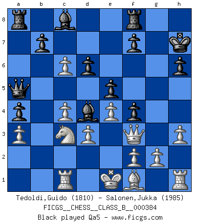 Last move : 0-1 2025 July 3 1:0:57 [Event "FICGS__CHESS__CLASS_B__000384"] [Site "FICGS"] [Date "2025.04.29"] [Round "1"] [White "Tedoldi,Guido"] [Black "Salonen,Jukka"] [Result "0-1"] [WhiteElo "1810"] [BlackElo "1985"] 1.c4 e5 2.Nc3 Nf6 3.e4 Bc5 4.h3 Nc6 5.Nf3 d6 6.d3 O-O 7.Bg5 h6 8.Bh4 g5 9.Bg3 Nh5 10.Bh2 Nf4 11.Bxf4 gxf4 12.a3 Kh7 13.Nd5 Nd4 14.b4 Nxf3+ 15.Qxf3 Bd4 16.Rc1 c6 17.Nc3 a5 18.b5 a4 19.bxc6 Qa5 20.Kd2 bxc6 21.g3 Rb8 22.Bg2 Rb2+ 23.Kd1 Bxc3 24.Rc2 Qb6 25.Rxc3 Ra2 26.Rc2 Qb1+ 27.Rc1 Qb2 0-1 Follow this game move after move (download)The only thing Chess players have in common is Chess. (Lodewijk Prins) Frage: Wie viele Autos haben Sie schon zerstört? - Antwort: Nur zwei. (Loek van Wely) Un entendimiento a fondo de las continuaciones típicas del mate, hace de las combinaciones de sacrificio mas complicadas conducirlas a ellas no solo sin dificultad, sino casi de una manera natural. (Siegbert Tarrasch) Soyez une menace à chaque fois que vous vous asseyez pour jouer. (Ken Smith) Life is like a ten-speed bicycle: most of us have gears we never use. (Charles M. Schulz)