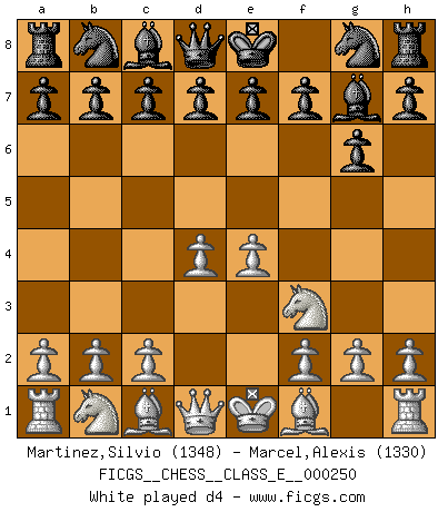 Last move : 0-1 2025 August 10 8:12:37 [Event "FICGS__CHESS__CLASS_E__000250"] [Site "FICGS"] [Date "2025.05.07"] [Round "1"] [White "Martinez,Silvio"] [Black "Marcel,Alexis"] [Result "0-1"] [WhiteElo "1348"] [BlackElo "1330"] 1.e4 g6 2.Nf3 Bg7 3.d4 e6 4.Nc3 Ne7 5.Bd3 O-O 6.O-O b6 7.Bf4 Bb7 8.Nb5 d6 9.d5 Bxb2 10.Rb1 Bg7 11.Re1 a6 12.Nc3 Bxc3 13.Re3 exd5 14.exd5 Nxd5 15.Re4 Ba5 16.Nd4 Nc3 17.Qe1 Nxe4 18.Qe3 Nc3 19.Rb2 Nd1 20.Qc1 Nxb2 21.Qxb2 Nd7 22.h3 Qh4 23.Bg3 Qf6 24.c3 c5 25.Nb3 Bxc3 26.Qc2 Rfe8 27.Nd2 d5 28.Nf3 Ne5 29.Qxc3 Nxf3+ 30.gxf3 Qxc3 31.Bf1 Re1 32.Kg2 d4 33.Bc7 Qxf3+ 34.Kg1 Qh1+ 0-1 Follow this game move after move (download)Excellence at Chess is one mark of a scheming mind. (Sir Arthur Conan Doyle) Wenn Du nicht kämpfst, um anderen etwas zu beweisen, sondern nur für Dich selbst, dann bist du fast unbesiegbar. (Garry Kasparov) Si un gobernante no entiende al Ajedrez, ¿como puede governar él un reinado?. (El Rey Khusros II) J'apprécie les joueurs d'est-indienne, c'est grâce à eux que je nourris ma famille depuis tant d'années. (Petrosian) He who defends everything defends nothing. (Frederick the Great)