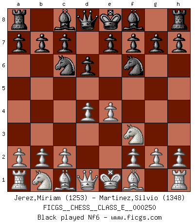 Last move : 0-1 2025 September 25 3:16:53 [Event "FICGS__CHESS__CLASS_E__000250"] [Site "FICGS"] [Date "2025.05.07"] [Round "1"] [White "Jerez,Miriam"] [Black "Martinez,Silvio"] [Result "0-1"] [WhiteElo "1253"] [BlackElo "1348"] 1.e4 d6 2.Nf3 Nc6 3.d4 Nf6 4.Nc3 e5 5.d5 Ne7 6.Bc4 Ng6 7.O-O h5 8.Bg5 Be7 9.h3 Nxe4 10.Nxe4 Bf5 11.Bxe7 Qxe7 12.Re1 O-O 13.b4 a6 14.Bd3 Nf4 15.h4 Bg4 16.Re3 Bxf3 17.Qxf3 Qxh4 18.Qg3 Qxg3 19.Rxg3 Nxd5 20.Bc4 Nxb4 21.c3 Nc2 22.Rc1 Na3 23.Bd5 c6 24.Bb3 d5 25.Nd6 b6 26.Re1 e4 27.R1e3 Rfd8 28.Nf5 g6 29.f4 Kh7 30.Nh4 Nb5 31.a4 Nd6 32.Rg5 Nc4 33.Re2 Rd6 34.Re1 Re8 35.Kh2 e3 36.f5 gxf5 37.Rxf5 f6 38.Rxh5+ Kg7 39.Bd1 Nb2 40.Nf5+ Kg8 41.Rxe3 Rxe3 42.Bc2 Re2 43.Nxd6 Rxc2 44.Rh6 Kg7 45.Rh3 Nxa4 46.Rg3+ Kf8 47.Rg6 Ke7 48.Nf5+ Kf7 49.Rg4 Nxc3 50.Rg7+ Ke6 51.Nd4+ Ke5 52.Nxc6+ Kf5 53.Ne7+ Ke6 54.Nc6 a5 55.Kh3 Ne4 56.Rg6 Rxc6 57.Kg4 a4 0-1 Follow this game move after move (download)The enormous mental resilience, without which no Chess player can exist, was so much taken up by Chess that he could never free his mind of this game. (Albert Einstein) Mein erstes Ziel war nicht, die Partie zu gewinnen, sondern eine Figur zu opfern. -- der junge (Wilhelm Steinitz) Hasta este punto, las blancas han seguido un análisis bien conocido. Pero ahora el hace un error fatal: empieza a usar su propia cabeza. (Siegbert Tarrasch) La conception d'un plan est le processus par lequel un joueur exploite les avantages de sa position tout en s'efforçant d'en réduire au minimum les inconvénients. Afin de garantir le succès, un plan doit toujours se fonder sur un diagnostic objectif des particularités d'une position. La conception d'un plan est d'autant plus difficile que la position est équilibrée, et grandement facilitée lorsqu'il n'existe qu'un seul plan susceptible de répondre aux exigences de la position. (Harry Golombek) Those parts of the system that you can hit with a hammer (not advised) are called hardware; those program instructions that you can only curse at are called software. (Anonymous)