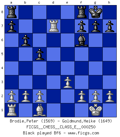 Last move : a5 2025 November 27 18:42:2 White clock - 17 days 00:46:00 Black clock - 75 days 11:31:00 [Event "FICGS__CHESS__CLASS_E__000250"] [Site "FICGS"] [Date "2025.05.07"] [Round "1"] [White "Brodie,Peter"] [Black "Goldmund,Heike"] [Result "*"] [WhiteElo "1569"] [BlackElo "1649"] 1.Nf3 Nf6 2.Nc3 e6 3.d4 c5 4.e3 b6 5.Bc4 Bb7 6.O-O Bxf3 7.Qxf3 Nc6 8.Rd1 Be7 9.d5 Ne5 10.Qe2 Nxc4 11.Qxc4 Nxd5 12.Nxd5 exd5 13.Qxd5 O-O 14.Qxd7 Qxd7 15.Rxd7 Bf6 16.Rd3 Rfd8 17.Rb1 Rxd3 18.cxd3 Rd8 19.d4 cxd4 20.exd4 Rxd4 21.Be3 Rc4 22.Rc1 Rxc1+ 23.Bxc1 Kf8 24.f4 Ke7 25.b3 Bd4+ 26.Kf1 f5 27.Ke2 g6 28.Kd3 Bc5 29.Be3 Kd6 30.Bxc5+ Kxc5 31.Kc3 a5 32.* Follow this game move after move (download)A man that will take back a move at Chess will pick a pocket. (Richard Fenton) Darum geht es im Schach. Einen Tag gibst du deinem Gegner eine Lektion, am nächsten Tag gibt er dir eine. (Robert James Fischer) Fischer deseaba darle a los Rusos una sopa de su propia medicina. (Larry Evans) Il s'avisa de me proposer d'apprendre les échecs qu'il jouait un peu... me voilà forcené des échecs. J'achète un échiquier, je m'enferme dans ma chambre, j'y passe des jours et des nuits à vouloir apprendre par cur toutes les parties. (Jean-Jacques Rousseau, Confessions) Who needs drugs and alcohol if he can play Big Chess at FICGS ? (Heinz-Georg Lehnhoff)