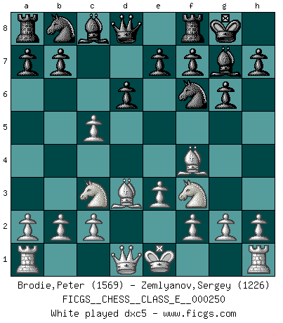 Last move : 1-0 2025 August 8 2:20:47 [Event "FICGS__CHESS__CLASS_E__000250"] [Site "FICGS"] [Date "2025.05.07"] [Round "1"] [White "Brodie,Peter"] [Black "Zemlyanov,Sergey"] [Result "1-0"] [WhiteElo "1569"] [BlackElo "1226"] 1.d4 Nf6 2.Nf3 g6 3.Bf4 Bg7 4.Nc3 O-O 5.e3 d6 6.Bd3 c5 7.dxc5 dxc5 8.O-O Qb6 9.b3 Qa5 10.Nd5 Nxd5 11.Be5 Nc6 12.Bxg7 Kxg7 13.Qd2 Qxd2 14.Nxd2 1-0 This chess game has been lost on time (started : 2025.05.07 1:40:52) Follow this game move after move (download)Nonsense was the last thing Fischer was interested in, as far as Chess was concerned. (Elie Agur) Was ist der Unterschied zwischen einem Strassenarbeiter und einem Schachspieler? --Der Schachspieler bewegt sich ab und zu. (Anonymous) La belleza de un movimiento no se refleja solo en su apariencia, sino en el pensamiento detrás de él. (Siegbert Tarrasch) Un journaliste : 'Vous préférez avoir une dame de plus sur l'échiquier ou au lit ?' Boris Spassky : 'Ca dépend de la position.' My poor ole parrot... Is not in the circulation of displays ....poo hoo hoo :) (Wayne Lowrance's enigma)