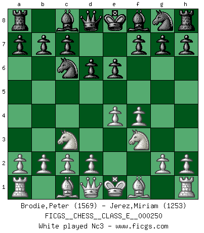 Last move : 1-0 2025 December 24 16:21:40 [Event "FICGS__CHESS__CLASS_E__000250"] [Site "FICGS"] [Date "2025.05.07"] [Round "1"] [White "Brodie,Peter"] [Black "Jerez,Miriam"] [Result "1-0"] [WhiteElo "1569"] [BlackElo "1253"] 1.e4 d6 2.f4 Nc6 3.Nf3 e6 4.Nc3 Nf6 5.d3 g6 6.Be2 d5 7.e5 Nd7 8.Be3 Bb4 9.O-O O-O 10.d4 b6 11.Bb5 Bb7 12.Bd2 h5 13.a3 Bxc3 14.Bxc3 a6 15.Bd3 a5 16.Bb5 Na7 17.Bd3 Nc6 18.Qd2 Ne7 19.b4 Nc6 20.b5 Na7 21.a4 c5 22.dxc5 Nxc5 23.Be2 Rc8 24.Bd4 Ne4 25.Qd3 Rc7 26.Rfc1 Nc8 27.c4 dxc4 28.Rxc4 Bd5 29.Rxc7 Qxc7 30.Bb2 Qc5+ 31.Qd4 Qc2 32.Bd3 Qc5 33.Qxc5 Nxc5 34.Bc2 Kh7 35.Nd4 Ne4 36.Bxe4 Bxe4 37.Re1 Bb7 38.Rc1 Rd8 39.Rc7 Be4 40.Rxf7+ Kh6 41.Nxe6 Rd1+ 42.Kf2 Rd2+ 43.Ke3 Rxb2 44.Kxe4 Rxg2 45.Rf8 Re2+ 46.Kf3 1-0 Follow this game move after move (download)The Pin is mightier than the sword. (Fred Reinfeld) Auf Remis zu spielen ist gewissermaßen ein Verbrechen gegen das Schachspiel. (Mikhail Nekhemyevich Tal) Un jugador que trata de regresar una movida en el Ajedrez es un futuro carterista. (Richard Fenton) Il n'y a pas de prix trop élevé au scalp de l'ennemi. (Koblentz) Art is the triumph over chaos. (John Cheever)