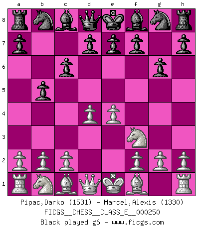 Last move : 0-1 2025 November 12 7:37:48 [Event "FICGS__CHESS__CLASS_E__000250"] [Site "FICGS"] [Date "2025.05.07"] [Round "1"] [White "Pipac,Darko"] [Black "Marcel,Alexis"] [Result "0-1"] [WhiteElo "1531"] [BlackElo "1330"] 1.e4 c6 2.Nf3 b5 3.d4 g6 4.c3 Bg7 5.h3 Na6 6.Qb3 e6 7.Be2 Ne7 8.Bg5 O-O 9.Bxe7 Qxe7 10.O-O Bb7 11.Nbd2 Nc7 12.Rfe1 a6 13.a3 a5 14.Kf1 a4 15.Qb4 Qxb4 16.axb4 f5 17.exf5 exf5 18.b3 axb3 19.Nxb3 Nd5 20.Rxa8 Rxa8 21.c4 bxc4 22.Bxc4 Kf8 23.Ne5 Bxe5 24.Bxd5 Bd6 25.Bf3 Bxb4 26.Rb1 Ba6+ 27.Be2 Bxe2+ 28.Kxe2 Ra2+ 29.Kf3 Ra3 30.Kf4 d6 31.Rb2 Bc3 32.Rb1 Ra2 33.Kg3 Ra3 34.f3 Kf7 0-1 This chess game has been lost on time (started : 2025.05.07 1:40:52) Follow this game move after move (download)A passed Pawn increases in strength as the number of pieces on the board diminishes. (Capablanca) Das typische an einem Großmeister ist, daß er eine gewonnene Position schnell und schmerzlos gewinnt. (Irving Chernev) No es una movida, aún la mejor movida que tu debas buscar, sino un plan comprensible. (Eugene Znosko-Borovsky) J'ai vu le vaincu d'Echecs jouer des années durant dans l'espoir de la fête de la victoire. Car tu es plus riche de ce qu'elle existe si même elle n'est point pour toi. Ainsi de la perle du fond des mers. (Antoine de Saint-Exupéry) Don't anthropomorphize computers - they hate it. (Anonymous)