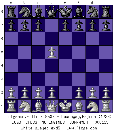 Last move : 1-0 2025 June 18 3:49:59 [Event "FICGS__CHESS__NO_ENGINES_TOURNAMENT__000135"] [Site "FICGS"] [Date "2025.05.07"] [Round "1"] [White "Trigance,Emile"] [Black "Upadhyay,Rajesh"] [Result "1-0"] [WhiteElo "1850"] [BlackElo "1738"] 1.e4 d5 2.exd5 Qxd5 3.Nc3 Qa5 4.d4 Nf6 5.Nf3 Bf5 6.Bc4 1-0 This chess game has been lost on time (started : 2025.05.07 8:31:46) Follow this game move after move (download)I am the best player in the world and I am here to prove it. (Bobby Fischer) Im Fernschach kannst du während dem Spiel rauchen. (John Christen Knudsen) Dios mío, Bobby Fischer juega tan simple. (Alexei Suetin) Une platitude souvent récitée à propos des Echecs est qu'une des choses les plus difficiles à réaliser est de gagner une position gagnante. Cela ne manque pas de sens mais, pour ma part, j'ai toujours trouvé plus difficile de gagner une position perdante. (Tim Krabbe) Luck is what you have left over after you give 100 percent. (Langston Coleman)