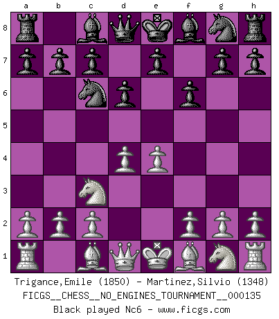 Last move : 1-0 2025 September 5 22:55:11 [Event "FICGS__CHESS__NO_ENGINES_TOURNAMENT__000135"] [Site "FICGS"] [Date "2025.05.07"] [Round "1"] [White "Trigance,Emile"] [Black "Martinez,Silvio"] [Result "1-0"] [WhiteElo "1850"] [BlackElo "1348"] 1.e4 d6 2.d4 f6 3.Nc3 Nc6 4.Bc4 e5 5.d5 Nd4 6.Nge2 Bg4 7.Qd3 Nh6 8.f3 Bh5 9.Nxd4 exd4 10.Qxd4 Qe7 11.Bxh6 gxh6 12.Bb5+ Kd8 13.O-O-O a6 14.Bd3 Qe5 15.Ne2 Qxd4 16.Nxd4 Bg7 17.Ne6+ Ke7 18.Nxg7 Bg6 19.Nf5+ Bxf5 20.exf5 b5 21.Rhe1+ Kf7 22.Re6 c5 23.Rde1 Rag8 24.Re7+ Kf8 25.Re8+ Kf7 26.R1e7+ 1-0 Follow this game move after move (download)Personally, I rather look forward to a computer program winning the world Chess Championship. Humanity needs a lesson in humility. (Richard Dawkings) Jeder weiß, dass Gasprom Putins persönliches Machtinstrument ist. Die Firma wird vom Kreml aus geleitet und wird schon deshalb nie transparent sein. (Garry Kasparov) Aquel que ve no otra dirección en el juego que la de dar Jaque Mate a su oponente, nunca será un buen jugador de Ajedrez. (Euwe) Votre seul travail dans les ouvertures est d'obtenir un milieu de partie jouable. (Lajos Portish) Unless in communicating with it one says exactly what one means, trouble is bound to result. (Alan Turing, about computers)