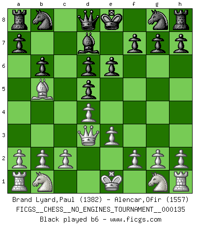 Last move : 1-0 2025 September 8 15:29:27 [Event "FICGS__CHESS__NO_ENGINES_TOURNAMENT__000135"] [Site "FICGS"] [Date "2025.05.07"] [Round "1"] [White "Brand Lyard,Paul"] [Black "Alencar,Ofir"] [Result "1-0"] [WhiteElo "1382"] [BlackElo "1557"] 1.d4 d5 2.Bf4 e6 3.e3 Bd6 4.Bxd6 cxd6 5.Bb5+ Bd7 6.Qd3 b6 7.Nf3 Bxb5 8.Qb3 Bc4 9.Qa4+ Qd7 10.Qxd7+ Kxd7 11.b3 Bb5 12.a4 Bc6 13.O-O Nf6 14.Ng5 Ke7 15.Nc3 h6 16.Nf3 Ne4 17.Nxe4 dxe4 18.Nd2 d5 19.c4 dxc4 20.Nxc4 Nd7 21.f4 1-0 This chess game has been lost on time (started : 2025.05.07 8:31:46) Follow this game move after move (download)Many have become Chess Masters, no one has become the Master of Chess. (Siegbert Tarrasch) Pläne sind die Träume des Verständigen. (Ernst Freiherr von Feuchtersleben) Todavía soy una víctima del Ajedrez. Tiene toda la belleza del arte y mucho mas. No puede ser comercializado. El Ajedrez es mas puro que el arte en su posición social. (Marcel Duchamp) D'abord les bases : Jouez et étudiez, puis étudiez et jouez, ensuite jouez et étudiez, puis étudiez et jouez. Deuxièmement : Donnez toujours le meilleur de vous-même ! (Ken Smith) Computers are like Old Testament gods; lots of rules and no mercy. (Joseph Campbell)