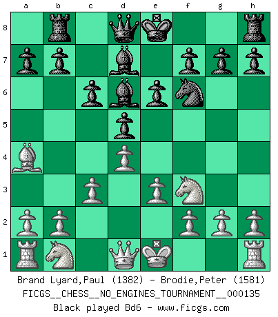 Last move : 1/2-1/2 2025 November 12 14:8:41 [Event "FICGS__CHESS__NO_ENGINES_TOURNAMENT__000135"] [Site "FICGS"] [Date "2025.05.07"] [Round "1"] [White "Brand Lyard,Paul"] [Black "Brodie,Peter"] [Result "1/2-1/2"] [WhiteElo "1382"] [BlackElo "1581"] 1.d4 d5 2.Bf4 Nf6 3.e3 e6 4.Bb5+ c6 5.Bxb8 Rxb8 6.Ba4 Bd7 7.Nf3 Bb4+ 8.c3 Bd6 9.Ne5 Qb6 10.Nxd7 Nxd7 11.b3 O-O 12.O-O Qc7 13.g3 b5 14.Bxb5 cxb5 15.b4 Nb6 16.Qb3 Qc4 17.Qxc4 Nxc4 18.f4 Nxe3 19.Re1 Nc2 20.Na3 Nxe1 21.Rxe1 a6 22.Nc2 Rbe8 23.Ne3 f5 24.h4 h5 25.a3 Rc8 26.Rc1 Kh7 27.Kf2 g6 28.Kf3 Rf7 29.Kf2 Rfc7 30.Nd1 Rc4 31.Ke3 Kg7 32.Rc2 Kf6 33.Kd3 Re8 34.Ne3 R4c8 35.Ra2 Ra8 36.a4 Ke7 37.a5 Rac8 38.Rh2 Rc7 39.Rg2 Rec8 40.Rc2 Kf6 41.Ng2 Rc4 42.Ne3 R4c6 43.Kd2 Rg8 44.Kd3 Rgc8 1/2-1/2 Follow this game move after move (download)All my games are real. (Bobby Fischer) Schach ist ein Reich, wo sich die menschliche Phantasie frei entfalten kann. (David Bronstein) El Ajedrez lo es todo: arte, ciencia y deporte. (Anatoly Karpov) Les échecs, c'est la lutte contre l'erreur. (Johannes Zukertort) Life is painting a picture, not doing a sum. (Oliver Wendell Holmes, Jr.)