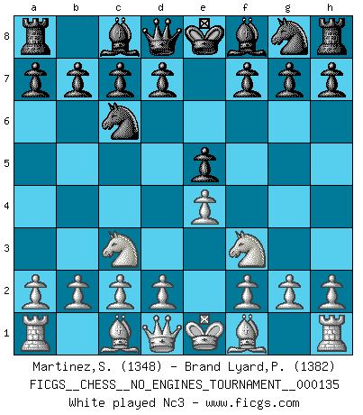 Last move : 1-0 2025 August 18 9:41:16 [Event "FICGS__CHESS__NO_ENGINES_TOURNAMENT__000135"] [Site "FICGS"] [Date "2025.05.07"] [Round "1"] [White "Martinez,Silvio"] [Black "Brand Lyard,Paul"] [Result "1-0"] [WhiteElo "1348"] [BlackElo "1382"] 1.e4 e5 2.Nf3 Nc6 3.Nc3 d6 4.Bb5 Bd7 5.O-O Bg4 6.h3 Bxf3 7.Qxf3 f6 8.d3 a6 9.Bxc6+ bxc6 10.Be3 c5 11.a3 g5 12.Rad1 Qe7 13.Nd5 Qd7 14.Nxf6+ Nxf6 15.Qxf6 Qe7 16.Qxh8 Qg7 17.Qxg7 Bxg7 18.Bxg5 a5 19.Rde1 h6 20.Bh4 Kd7 21.f4 exf4 22.Rxf4 Bxb2 23.Rf7+ Kc6 24.a4 Bc3 25.Ref1 Bd4+ 26.Kh1 Rg8 27.Rb1 h5 28.Rb3 d5 29.exd5+ Kxd5 30.Rxc7 Be5 31.Rcb7 Rg6 32.R3b5 Ra6 33.Bf2 Kc6 34.Rh7 Kd5 35.Rxc5+ Ke6 36.Rh6+ Bf6 37.Bh4 Kd6 38.Rcxh5 Ke7 39.Rh7+ Ke6 40.Bxf6 Ra8 41.R7h6 Kf7 42.Rg5 Rc8 43.Bd4 Rxc2 44.Rg7+ Kf8 45.Rh8+ 1-0 Follow this game move after move (download)Botvinnik tried to take the mystery out of Chess, always relating it to situations in ordinary life. He used to call Chess a typical inexact problem similar to those which people are always having to solve in everyday life. (Garry Kasparov) Deine Wertungszahl - vorausgesetzt einige Jahre schachliche Anstrengung - entspricht etwa dem zehnfachen Deines IQ plus 1000. (Jonathan Levitt) ¿Se han dado cuenta de que Fischer casi nunca ha tenido piezas malas? El las intercambia y las piezas malas se quedan con sus oponenets. (Yuri Balashov) Il n'y a pas de prix trop élevé au scalp de l'ennemi. (Koblentz) Tomorrow's what you make of it. (Horatio Caine, C.S.I. Miami)