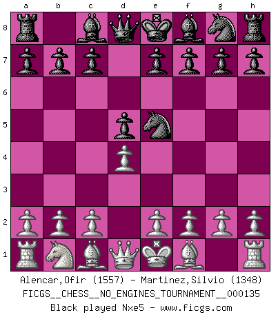 Last move : 0-1 2025 August 18 1:1:54 [Event "FICGS__CHESS__NO_ENGINES_TOURNAMENT__000135"] [Site "FICGS"] [Date "2025.05.07"] [Round "1"] [White "Alencar,Ofir"] [Black "Martinez,Silvio"] [Result "0-1"] [WhiteElo "1557"] [BlackElo "1348"] 1.d4 d5 2.Nf3 Nc6 3.Ne5 Nxe5 4.dxe5 g6 5.c3 Bg7 6.f4 Bf5 7.e3 e6 8.Bb5+ c6 9.Bd3 Ne7 10.Bxf5 gxf5 11.b3 Qb6 12.Bd2 O-O-O 13.Qe2 Ng6 14.h3 h5 0-1 This chess game has been lost on time (started : 2025.05.07 8:31:46) Follow this game move after move (download)Could we look into the head of a Chess player, we should see there a whole world of feelings, images, ideas, emotion and passion. (Alfred Binet) Es hat in meinem Leben Zeiten gegeben, in denen das Schachspiel, wenn nicht zum Lebenszweck, so doch zu einem regelrechten Lebensersatz geworden ist. Man fühlt sich in solchen Zeiten nicht so, als besäße man eine göttliche Gabe, sondern eher so, als sei man von ihr besessen. (Garry Kasparov) Una victoria por una combinación errónea, aunque sea espectacular, me llena de horror artístico. (Wilhelm Steinitz) Même si l'adversaire joue le coup analysé précédemment, recommencez l'analyse en voyant la nouvelle position. Première règle de Blumenfeld There are two kinds of tragedy in this world, one is not getting what you want and the other is getting. (Lord of war)