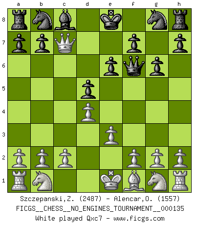 Last move : 1-0 2025 July 31 5:49:2 [Event "FICGS__CHESS__NO_ENGINES_TOURNAMENT__000135"] [Site "FICGS"] [Date "2025.05.07"] [Round "1"] [White "Szczepanski,Zbigniew"] [Black "Alencar,Ofir"] [Result "1-0"] [WhiteElo "2487"] [BlackElo "1557"] 1.d4 d5 2.Bf4 e6 3.e3 Bd6 4.Qg4 g6 5.Qf3 Bxf4 6.Qxf4 Qf6 7.Qxc7 Qd8 8.Qc3 Nc6 9.Nd2 Nf6 10.Be2 O-O 11.Ngf3 Ne4 12.Nxe4 dxe4 13.Nd2 f5 14.b4 a6 15.a4 Bd7 16.O-O Qb6 17.Rfb1 Rfc8 18.Qb2 a5 19.b5 Nb4 20.c3 1-0 This chess game has been lost on time (started : 2025.05.07 8:31:46) Follow this game move after move (download)The hallmark of the artist is simplicity. (Larry Evans) Mein erstes Ziel war nicht, die Partie zu gewinnen, sondern eine Figur zu opfern. -- der junge (Wilhelm Steinitz) Observen a Garry Kasparov. Después de una derrota, invariablemente el gana la próxima partida. Prácticamente hace pedazos a su siguiente oponente. Eso es algo que tenemos que aprender a lograr. (Maurice Ashley) On croit qu'il y a plus de mauvais joueurs que de bons joueurs, c'est faux : Il y a autant de joueurs qui gagnent que de joueurs qui perdent. (Philippe Geluck) The weakness of an artist is dogma. (Josh Waitzkin)