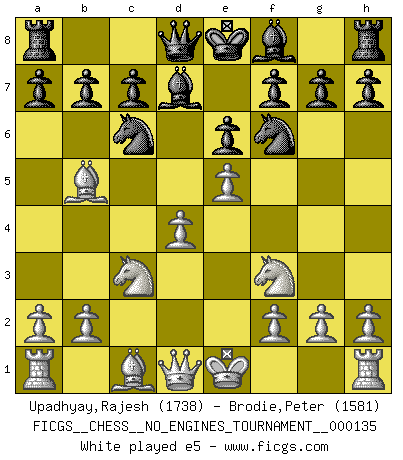 Last move : 0-1 2025 July 2 9:51:56 [Event "FICGS__CHESS__NO_ENGINES_TOURNAMENT__000135"] [Site "FICGS"] [Date "2025.05.07"] [Round "1"] [White "Upadhyay,Rajesh"] [Black "Brodie,Peter"] [Result "0-1"] [WhiteElo "1738"] [BlackElo "1581"] 1.Nf3 Nf6 2.c4 Nc6 3.d4 d5 4.cxd5 Nxd5 5.e4 Nf6 6.Nc3 e6 7.Bb5 Bd7 8.e5 Nd5 0-1 This chess game has been lost on time (started : 2025.05.07 8:31:46) Follow this game move after move (download)Chess is everything: art, science and sport. (Anatoly Karpov) Ich spiele ehrlich und spiele, um zu gewinnen. Wenn ich verliere nehme ich meine Medizin. (Robert James Fischer) Los tropiezos estan todos ahí en el tablero, esperando que se cometan. (Savielly Tartakover) J'ai vu le vaincu d'Echecs jouer des années durant dans l'espoir de la fête de la victoire. Car tu es plus riche de ce qu'elle existe si même elle n'est point pour toi. Ainsi de la perle du fond des mers. (Antoine de Saint-Exupéry) Creativity involves breaking out of established patterns in order to look at things in a different way. (Edward De Bono)