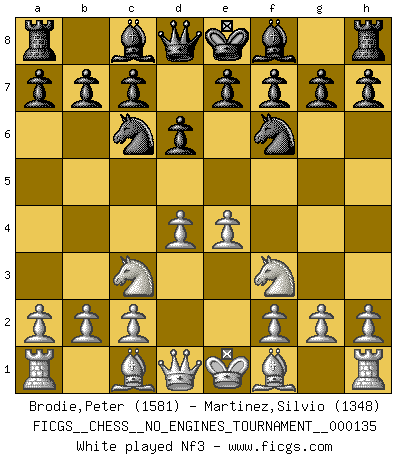 Last move : Rd1 2026 January 2 3:6:26 White clock - 48 days 09:23:15 Black clock - 84 days 10:31:34 (59 days 15:29:29) [Event "FICGS__CHESS__NO_ENGINES_TOURNAMENT__000135"] [Site "FICGS"] [Date "2025.05.07"] [Round "1"] [White "Brodie,Peter"] [Black "Martinez,Silvio"] [Result "*"] [WhiteElo "1581"] [BlackElo "1348"] 1.e4 d6 2.d4 Nf6 3.Nc3 Nc6 4.Nf3 Bg4 5.Be2 e6 6.O-O d5 7.e5 Ne4 8.h3 Bxf3 9.gxf3 Nxc3 10.bxc3 Be7 11.Bb5 O-O 12.Bd3 a6 13.Rb1 b5 14.Rb3 Na5 15.Rb1 Bg5 16.Bxg5 Qxg5+ 17.Kh2 Nc6 18.Rg1 Qf4+ 19.Rg3 h5 20.Qc1 Qxc1 21.Rxc1 Ne7 22.Rcg1 g6 23.Rg5 c6 24.a3 a5 25.h4 Kh7 26.Be2 b4 27.axb4 a4 28.Ra1 Nc8 29.b5 cxb5 30.Bxb5 Nb6 31.R5g1 a3 32.Ra2 Rfb8 33.Bc6 Ra6 34.Bb5 Ra5 35.Bd3 Nd7 36.Rga1 Rba8 37.c4 dxc4 38.Bxc4 Nb6 39.Bb3 Kg8 40.Rd1 * Follow this game move after move (download)White lost because he failed to remember the right continuation and had to think up the moves himself. (Siegbert Tarrasch) Nicht daß Diemer aus Opportunismus Mitglied der NSDAP geworden wäre. Er war ein Fanatiker, in allem, was er tat. (Hans Ree) El Ajedrez es parte de una cultura y si una cultura esta en decadencia, entonces también el Ajedrez declinará. (Mikhail Botvinnik) Les échecs sont un jeu terrible. Si vous n'avez pas le centre, votre adversaire a une position plus libre. Par contre, si vous avez le centre, alors vous avez vraiment quelque chose pour laquelle vous inquiéter ! (Siegbert Tarrasch) If things go wrong, don't go with them. (Roger Babson)