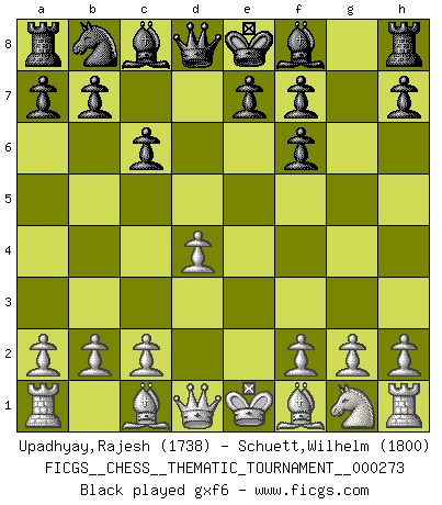 Last move : 0-1 2025 August 16 17:10:35 [Event "FICGS__CHESS__THEMATIC_TOURNAMENT__000273"] [Site "FICGS"] [Date "2025.05.07"] [Round "1"] [White "Upadhyay,Rajesh"] [Black "Schuett,Wilhelm"] [Result "0-1"] [WhiteElo "1738"] [BlackElo "1800"] 1.e4 c6 2.d4 d5 3.Nc3 dxe4 4.Nxe4 Nf6 5.Nxf6+ gxf6 6.c3 Bf5 7.Ne2 Nd7 8.h4 h5 9.Ng3 Bg6 10.Bd3 Qa5 11.b4 Qd5 12.O-O a5 13.c4 Qxd4 14.Bxg6 Qxa1 15.Bxf7+ Kxf7 16.Qxd7 Qxa2 17.Ne4 axb4 0-1 This chess game has been lost on time (started : 2025.05.07 22:36:56) Follow this game move after move (download)Not all artists are Chess players, but all Chess players are artists. (Marcel Duchamp) Fischer: 'Remis!?' Uhlmann: 'Aber es muss doch dreimal Zugwiederholung sein!' Fischer: 'Sie nehmen das Remis an, wie ich es sage, sonst spiele ich weiter und werde Sie dann schlagen!' (Robert James Fischer) Bobby Fischer es el mas grande genio de Ajedrez de todos los tiempos. (Alexander Kotov) Une platitude souvent récitée à propos des Echecs est qu'une des choses les plus difficiles à réaliser est de gagner une position gagnante. Cela ne manque pas de sens mais, pour ma part, j'ai toujours trouvé plus difficile de gagner une position perdante. (Tim Krabbe) I feel so... helpless. (C-3PO in Star Wars ep.3)
