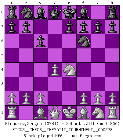 Last move : 0-1 2025 June 17 4:47:12 [Event "FICGS__CHESS__THEMATIC_TOURNAMENT__000273"] [Site "FICGS"] [Date "2025.05.07"] [Round "1"] [White "Biryukov,Sergey"] [Black "Schuett,Wilhelm"] [Result "0-1"] [WhiteElo "0981"] [BlackElo "1800"] 1.e4 c6 2.d4 d5 3.Nc3 dxe4 4.Nxe4 Nf6 0-1 This chess game has been lost on time (started : 2025.05.07 22:36:56) Follow this game move after move (download)Only the player with the initiative has the right to attack. (Wilhelm Steinitz) Gewöhnliche Menschen denken nur daran, wie sie ihre Zeit verbringen. Ein intelligenter Mensch versucht, sie auszunutzen. (Arthur Schopenhauer) Ayuda a tus piezas para que ellas te puedan ayudar. (Paul Morphy) Celui qui prend des risques peut perdre, celui qui n'en prend pas perd toujours. (Xavier Tartacover) The hypothalamus is one of the most important parts of the brain, involved in many kinds of motivation, among other functions. The hypothalamus controls the 'Four Fs: Fighting, Fleeing, Feeding and Mating. (Unknown author)