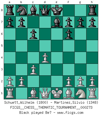 Last move : 1-0 2025 September 5 22:55:24 [Event "FICGS__CHESS__THEMATIC_TOURNAMENT__000273"] [Site "FICGS"] [Date "2025.05.07"] [Round "1"] [White "Schuett,Wilhelm"] [Black "Martinez,Silvio"] [Result "1-0"] [WhiteElo "1800"] [BlackElo "1348"] 1.e4 c6 2.d4 d5 3.Nc3 dxe4 4.Nxe4 Nf6 5.Nxf6+ exf6 6.c3 Be7 7.Bd3 Nd7 8.Qc2 b6 9.Bxh7 Ba6 10.Bd3 Bxd3 11.Qxd3 g6 12.Bf4 g5 13.Bg3 Nc5 14.Qe3 Kf8 15.dxc5 Bxc5 16.Qf3 Qe8+ 17.Ne2 Kg7 18.O-O-O a5 19.h4 Rd8 20.hxg5 fxg5 21.Rxh8 Qxh8 22.Be5+ Kg8 23.Rxd8+ Bf8 24.Bxh8 Kxh8 25.Rxf8+ Kg7 26.Qxf7+ 1-0 Follow this game move after move (download)At this time Fischer is simply a level above all the best Chessplayers in the world. (John Jacobs) Im Schach gibt es keinen Platz für Galanterie. (Irving Chernev) Durante una competencia de Ajedrez, un Maestro de Ajedrez deberá ser una combinación de presa de caza y un Monge. (Alexander Alekhine) La solitude du joueur d'Echecs à l'approche du mat est semblable à celle du condamné. (Francis Szpiner) All men can see these tactics whereby I conquer, but what none can see is the strategy out of which victory is evolved. (Sun Tzu)