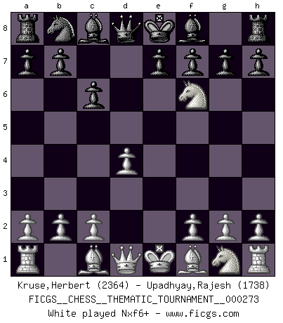 Last move : 1-0 2025 June 17 9:0:38 [Event "FICGS__CHESS__THEMATIC_TOURNAMENT__000273"] [Site "FICGS"] [Date "2025.05.07"] [Round "1"] [White "Kruse,Herbert"] [Black "Upadhyay,Rajesh"] [Result "1-0"] [WhiteElo "2364"] [BlackElo "1738"] 1.e4 c6 2.d4 d5 3.Nc3 dxe4 4.Nxe4 Nf6 5.Nxf6+ exf6 6.c3 Bd6 7.Bd3 O-O 8.Qc2 h5 9.Ne2 1-0 This chess game has been lost on time (started : 2025.05.07 22:36:56) Follow this game move after move (download)Every Pawn is a potential Queen. (James Mason) Schach ist Kampf, hauptsächlich jedoch gegen die eigenen Fehler. (Savielly Grigorievitsch Tartakower) Todos los jugadores de Ajedrez deberían tener un pasatiempo. (Savielly Tartakower) C'est la seule position que je connaisse où les deux camps sont mals. Propos prêtés à V. Anand. Statistics can be made to prove anything - even the truth. (Author unknown)