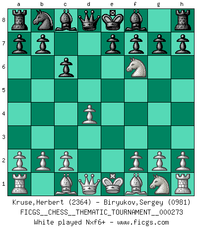 Last move : 1-0 2025 June 17 9:0:38 [Event "FICGS__CHESS__THEMATIC_TOURNAMENT__000273"] [Site "FICGS"] [Date "2025.05.07"] [Round "1"] [White "Kruse,Herbert"] [Black "Biryukov,Sergey"] [Result "1-0"] [WhiteElo "2364"] [BlackElo "0981"] 1.e4 c6 2.d4 d5 3.Nc3 dxe4 4.Nxe4 Nf6 5.Nxf6+ 1-0 This chess game has been lost on time (started : 2025.05.07 22:36:56) Follow this game move after move (download)On the chessboard, lies and hypocrisy do not survive long. (Emanuel Lasker) Das Schachspiel ist ein See, in welchem eine Mücke baden und ein Elefant ertrinken kann. (Emanuel Lasker) Solo los afeminados hacen el Enroque. (Rob Sillars) Les échecs sont un jeu par leur forme, un art par leur essence et une science par sa difficulté d'acquisition. Ils peuvent vous procurer autant de plaisir qu'un bon livre ou une belle musique, mais vous n'aurez une réelle joie que si vous arrivez à bien jouer. (Tigran Petrosian) When you have everything, sometimes it feels like nothing. (Horatio Caine, C.S.I. Miami)