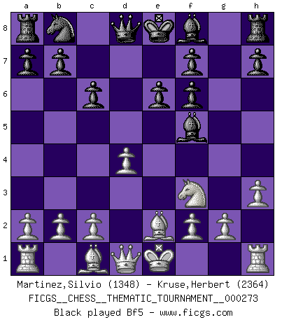 Last move : 0-1 2025 May 31 20:57:52 [Event "FICGS__CHESS__THEMATIC_TOURNAMENT__000273"] [Site "FICGS"] [Date "2025.05.07"] [Round "1"] [White "Martinez,Silvio"] [Black "Kruse,Herbert"] [Result "0-1"] [WhiteElo "1348"] [BlackElo "2364"] 1.e4 c6 2.d4 d5 3.Nc3 dxe4 4.Nxe4 Nf6 5.Nxf6+ gxf6 6.Nf3 Bg4 7.Be2 e6 8.h3 Bf5 9.Bf4 Bd6 10.Bxd6 Qxd6 11.O-O Rg8 12.Re1 Bxh3 13.g3 Rxg3+ 14.fxg3 Qxg3+ 0-1 Follow this game move after move (download)During a Chess competition a Chessmaster should be a combination of a beast of prey and a monk. (Alexander Alekhine) Ich hatte meine größten Erfolge, als ich 47 Jahre alt war. Kasparow war noch nicht mal 42 und hat das Schach schon im Stich gelassen. (Viktor Kortschnoi) Bobby es la celebridad menos entendida y malinterpretada que camina el la faz de esta tierra. (Yasser Seirawan) Les Echecs, c'est l'art de la guerre sans les charniers, c'est la résurrection des morts tombés au champ d'honneur, l'espoir perpétuel, la suprématie de l'intelligence sur la force, la culture de l'esprit. (F. Szpiner) There's no money in correspondence chess. (John Knudsen)