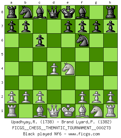 Last move : 0-1 2025 June 17 9:0:38 [Event "FICGS__CHESS__THEMATIC_TOURNAMENT__000273"] [Site "FICGS"] [Date "2025.05.07"] [Round "1"] [White "Upadhyay,Rajesh"] [Black "Brand Lyard,Paul"] [Result "0-1"] [WhiteElo "1738"] [BlackElo "1382"] 1.e4 c6 2.d4 d5 3.Nc3 dxe4 4.Nxe4 Nf6 5.Nxf6+ gxf6 6.c3 e5 7.Nf3 Bg4 8.Be2 Bxf3 0-1 This chess game has been lost on time (started : 2025.05.07 22:36:56) Follow this game move after move (download)Only sissies Castle. (Rob Sillars) Schach ist ein Kampf gegen den Fehler. (Johannes Herrman Zukertort) Tu no necesitas jugar muy bien, únicamente ayudar a tu oponenet a que juegue muy mal. (Genrikh Chepukaitis) Mais l'homme est une créature légère et illogique : semblable au joueur d'échecs, il n'aime que le processus du but à atteindre, non le but lui-même. (Dostoïevsky) He who defends everything defends nothing. (Frederick the Great)