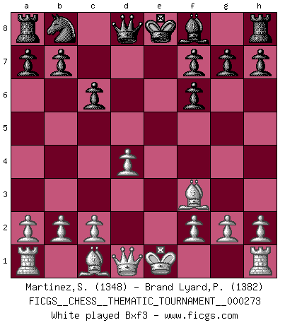 Last move : 1-0 2025 September 25 3:23:30 [Event "FICGS__CHESS__THEMATIC_TOURNAMENT__000273"] [Site "FICGS"] [Date "2025.05.07"] [Round "1"] [White "Martinez,Silvio"] [Black "Brand Lyard,Paul"] [Result "1-0"] [WhiteElo "1348"] [BlackElo "1382"] 1.e4 c6 2.d4 d5 3.Nc3 dxe4 4.Nxe4 Nf6 5.Nxf6+ exf6 6.Nf3 Bg4 7.Be2 Bxf3 8.Bxf3 Nd7 9.c3 Bd6 10.O-O g5 11.Re1+ Kf8 12.Be3 Rg8 13.h3 h6 14.Bg4 Nb6 15.Qb3 Qc7 16.Re2 Bh2+ 17.Kf1 Nd5 18.Qa3+ Kg7 19.g3 Rae8 20.Bf4 Nxf4 21.gxf4 Rxe2 22.Bxe2 Qxf4 23.Qe7 Qd2 24.Rb1 Rb8 25.Kg2 Qf4 26.Rh1 Qd2 27.Rxh2 Kg6 28.Qe4+ f5 29.Qe5 Qxb2 30.Qxb8 Qxe2 31.Qxb7 Qxa2 32.Qxc6+ Kh5 33.d5 a5 34.d6 Qe6 35.c4 a4 36.Kg3 f4+ 37.Kf3 a3 38.Rh1 g4+ 39.hxg4+ Kg5 40.Rh5+ Kg6 41.Ra5 f6 42.Rxa3 f5 43.gxf5+ Kxf5 44.Ra5+ Kf6 45.Kxf4 h5 46.Rxh5 Kg6 47.Rg5+ Kf6 48.c5 Qc4+ 49.Kf3 Kxg5 50.d7 Qg4+ 51.Ke3 Qf4+ 52.Ke2 Qe5+ 53.Kf1 Qa1+ 54.Kg2 Qh8 55.Qd5+ Kf6 56.d8Q+ Qxd8 57.Qxd8+ Ke5 58.Kf3 Ke6 59.Ke4 Kf7 60.Qf6+ Ke8 61.Qg7 Kd8 62.Kd5 Kc8 63.Kc6 Kb8 64.Qb7+ 1-0 Follow this game move after move (download)When the Chess game is over, the Pawn and the King go back to the same box. (Irish saying) Frage: Gibt es etwas was Sie mehr lieben als Autobahnen ohne Tempobegrenzungen? - Antwort: Deutsche Frauen ohne Tempobegrenzungen. (Loek van Wely) El muchacho (en ese entonces un niño de 12 años llamado Anatoly Karpov) no tiene ni idea de lo que es el Ajedrez y no hay futuro en absoluto para el en esta profesión. (Mikhail Botvinnik) Les Echecs mettent en conflit, non pas deux intelligences, mais deux volontés. (Lasker) To err is human, to shift the blame on someone else is tactical. (Mladen Jankovic)