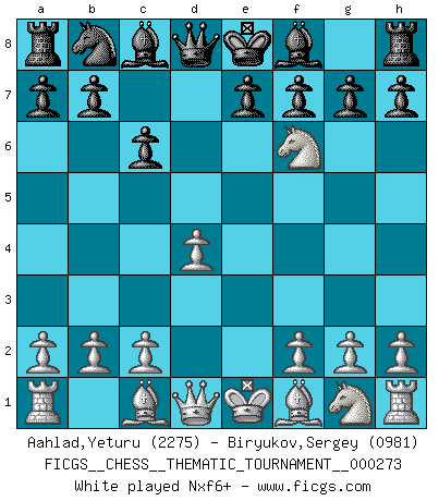 Last move : 1-0 2025 June 17 9:0:38 [Event "FICGS__CHESS__THEMATIC_TOURNAMENT__000273"] [Site "FICGS"] [Date "2025.05.07"] [Round "1"] [White "Aahlad,Yeturu"] [Black "Biryukov,Sergey"] [Result "1-0"] [WhiteElo "2275"] [BlackElo "0981"] 1.e4 c6 2.d4 d5 3.Nc3 dxe4 4.Nxe4 Nf6 5.Nxf6+ 1-0 This chess game has been lost on time (started : 2025.05.07 22:36:56) Follow this game move after move (download)Chess is a beautiful mistress. (Bent Larsen) Woher wissen wir, daß der Neanderthaler Blindschach gespielt hat? -- Bei Ausgrabungen wurden keine Schachbretter und Figuren gefunden. (Anonymous) Nunca nadie ha ganado una partida de Ajedrez rindiendose. (Unknown) Les ravages du H expliquent la différence de niveau entre Tal et Thal [Abergel]. We're missing something. (Gregory House, House M.D.)