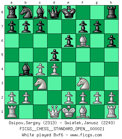 Last move : 1/2-1/2 2025 August 9 15:14:49 [Event "FICGS__CHESS__STANDARD_OPEN__000021"] [Site "FICGS"] [Date "2025.05.08"] [Round "1"] [White "Osipov,Sergey"] [Black "Swiatek,Janusz"] [Result "1/2-1/2"] [WhiteElo "2313"] [BlackElo "2243"] 1.d4 Nf6 2.c4 e6 3.Nf3 d5 4.Nc3 Bb4 5.Bg5 h6 6.Bxf6 Qxf6 7.e3 c5 8.cxd5 exd5 9.Be2 O-O 10.O-O Bxc3 11.bxc3 Qe7 12.Bd3 Nd7 13.a4 b6 14.h3 Bb7 15.Re1 Bc6 16.Qb1 Qd6 17.Bh7+ Kh8 18.Bf5 Rab8 19.Qd1 Kg8 20.a5 Nf6 21.axb6 axb6 22.Ra6 Qc7 23.Qb3 g6 24.Bc2 Nd7 25.Rea1 Ra8 26.Qb1 Qd6 27.h4 h5 28.Ne1 Rxa6 29.Rxa6 Ra8 30.Rxa8+ Bxa8 31.Nd3 Kg7 32.Bd1 Bc6 33.Nf4 Qe7 34.g3 Qd6 35.Bc2 Kf8 36.Qb2 Kg7 37.Kf1 Kg8 38.Bd1 Kg7 39.Bc2 Kg8 40.Qb1 1/2-1/2 Follow this game move after move (download)One doesn't have to play well, it's enough to play better than your opponent. (Siegbert Tarrasch) Dieses schreckliche Gefühl, dass ich gegen eine Maschine spielte, die niemals Fehler macht, zerschmetterte meinen Widerstand. (Mark Taimanov) El jugador blanco perdió porque fallo en recordar la coreccta continuación y tuvo que pensar por sí mismo las movidas. (Siegbert Tarrasch) Ne tendez aucun piège pour le plaisir ! Ne jouez rien dans l'espoir que l'adversaire réagisse de façon stupide ! Prenez toujours pour acquis que l'adversaire va trouver le meilleur coup ! Ne jouez jamais de coup dans l'espoir que l'adversaire ne voie pas la menace ! Chacun de vos coups doit améliorer la position d'une façon ou d'une autre. Programmer - an organism that turns coffee into software. (Anonymous)