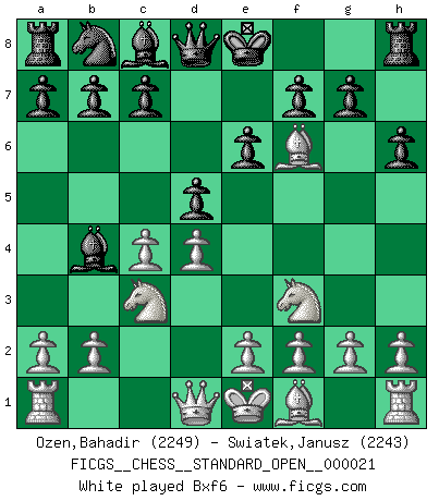Last move : 1/2-1/2 2025 July 13 20:17:46 [Event "FICGS__CHESS__STANDARD_OPEN__000021"] [Site "FICGS"] [Date "2025.05.08"] [Round "2"] [White "Ozen,Bahadir"] [Black "Swiatek,Janusz"] [Result "1/2-1/2"] [WhiteElo "2249"] [BlackElo "2243"] 1.d4 Nf6 2.c4 e6 3.Nf3 d5 4.Nc3 Bb4 5.Bg5 h6 6.Bxf6 Qxf6 7.e3 c5 8.cxd5 exd5 9.Be2 O-O 10.O-O Bxc3 11.bxc3 Nd7 12.dxc5 Qc6 13.a4 Nxc5 14.Nd4 Qc7 15.Bf3 Rd8 16.a5 Ne4 17.Qd3 Nf6 18.h3 Bd7 19.Rfb1 b6 20.Rc1 1/2-1/2 Follow this game move after move (download)Nonsense was the last thing Fischer was interested in, as far as Chess was concerned. (Elie Agur) Alles was am Schachbrett zählt sind gute Züge. (Robert James Fischer) Es muy difícil jugar en contra de la teoría de Einstein. - en su primera derrota en contra de Fischer (Mikhail Tal) 'L'échange des dames est un coup dur pour les deux adversaires...' Un journaliste lors d'une partie du match Spassky-Fischer If passion drives you, let reason holds the reins. (Benjamin Franklin)