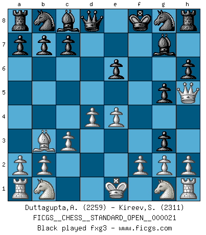 Last move : 1/2-1/2 2025 July 12 10:35:40 [Event "FICGS__CHESS__STANDARD_OPEN__000021"] [Site "FICGS"] [Date "2025.05.08"] [Round "1"] [White "Duttagupta,Aniruddha"] [Black "Kireev,Sergey"] [Result "1/2-1/2"] [WhiteElo "2259"] [BlackElo "2311"] 1.d4 f5 2.Bg5 h6 3.Bh4 g5 4.e4 Bg7 5.Bg3 d6 6.Bc4 d5 7.Bxd5 e6 8.Bb3 f4 9.Qh5+ Kf8 10.c3 fxg3 11.fxg3 Nf6 12.Qe2 c5 13.Nf3 Nc6 14.e5 Nd5 15.Nbd2 cxd4 16.Nxd4 Kg8 17.O-O Bd7 18.Rf2 Qe7 19.Nxc6 Bxc6 20.Raf1 Rf8 21.Rxf8+ Bxf8 22.Ne4 Bg7 23.c4 1/2-1/2 Follow this game move after move (download)I guess a certain amount of temperament is expected of Chess geniuses. (Ron Gross) Schach verlangt totale Konzentration. (Robert James Fischer) Ayuda a tus piezas para que ellas te puedan ayudar. (Paul Morphy) Je menace de comprendre la position. (Anonyme) You have to believe in yourself. (Sun Tzu)