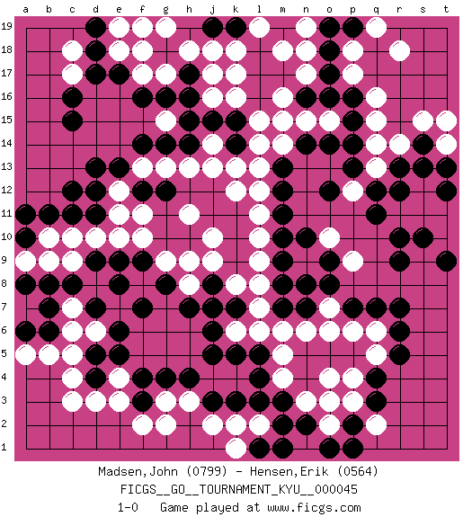 Last move : 1-0 2008 January 3 18:0:47 [Event "FICGS__GO__TOURNAMENT_KYU__000045"] [Site "FICGS"] [Date "2007.09.30"] [Round "1"] [Black "Madsen,John"] [White "Hensen,Erik"] [Result "1-0"] [Rating 1 "0799"] [Rating 2 "0564"] 1.q4 d3 2.d17 q16 3.c15 o4 4.r7 c5 5.j3 k16 6.o17 p17 7.o16 q14 8.l17 k17 9.l16 l15 10.m15 l14 11.o14 c10 12.c12 g17 13.m3 g3 14.r10 o6 15.o12 p4 16.q3 e10 17.f7 m5 18.j5 p18 19.o18 g15 20.d9 d10 21.d7 n3 22.m2 m4 23.g4 q6 24.r6 p9 25.f3 h3 26.h4 j2 27.k3 f2 28.f4 g2 29.d4 c4 30.d5 k2 31.n2 o2 32.l3 c6 33.c8 e18 34.d18 e3 35.r12 r14 36.j8 e12 37.d13 h11 38.m12 k12 39.e13 s13 40.f12 f11 41.g12 f13 42.f14 g13 43.g14 h13 44.h14 t10 45.s10 t11 46.t12 s12 47.t9 s11 48.r9 f17 49.h15 j14 50.g16 j18 51.j15 j13 52.h17 h18 53.k15 m18 54.l18 j10 55.p7 p6 56.q7 o7 57.o8 r11 58.q11 n18 59.p19 q19 60.o19 r18 61.e17 f19 62.g18 l10 63.o9 g19 64.f16 q5 65.r5 g9 66.g8 f18 67.j19 k8 68.k7 j9 69.h7 l8 70.p2 c18 71.d19 l7 72.n8 k6 73.j7 a7 74.b11 b10 75.b7 p3 76.o1 m14 77.n14 m16 78.m17 n15 79.n16 k18 80.k19 n17 81.m15 j16 82.h16 m16 83.r13 l19 84.s14 s15 85.t13 o15 86.p15 m15 87.p14 q13 88.p16 q15 89.p13 t15 90.b6 o10 91.n10 b5 92.a6 c17 93.c16 d6 94.e6 c7 95.a8 a5 96.d12 e11 97.f9 f10 98.e9 h9 99.k5 m6 100.j6 b9 101.b8 o3 102.m10 l11 103.m13 l2 104.n7 e4 105.e5 c3 106.a11 t14 107.s13 p12 108.q12 n1 109.m1 d8 110.e8 l6 111.m9 n6 112.m11 l9 113.l4 q2 114.p1 l13 115.k14 n19 116.l1 k1 117.c11 k13 118.pass c9 119.l5 h8 120.a10 a9 121.m8 l12 122.m7 e19 123.d11 j17 124.pass 1-0 Here are the names of the openings (joseki) played in the four corners : Corner q4 : q4 o4 Hoshi (Hwajeom, Seongjeom, Xingwei`) 4-4 Point. The star or hoshi (4-4) point, emphasizing influence at the potential expense of territory. Ikken Takagakari (Hankan Nop'dakeolch'im, Yi Gaojia, 1-Space High Approach). Black typically responds at 6-4 or 3-10. Black 4-10 is played when Black finds play on the right side advantageous. Black 4-8 or 3-8 may be played when Black has support at top. Corner q16 : q16 o17 Hoshi (Hwajeom, Seongjeom, Xingwei`) 4-4 Point. The star or hoshi (4-4) point, emphasizing influence at the potential expense of territory. Ikken Kakari (Hankan Keolch'im, Yi Gua`jiao~, 1-Space Low Approach). Black 2 is the standard approach move to the 4-4. Player Black won this Go (weiqi, baduk) game. Follow this game move after move (download)Go is not a blocking game, it's a game of action. (Pierre Audouard) Without enthusiasm, virtue functions not at all, and vice only poorly. (Mignon McLaughlin, The Neurotic's Notebook, 1960)